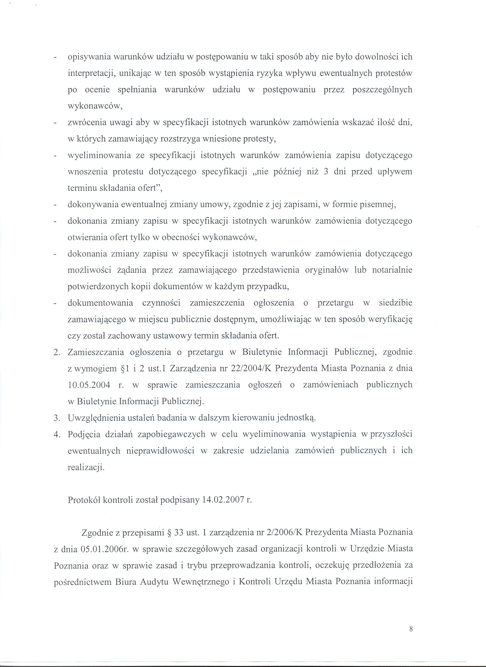 - 2. Zamieszczania ogłoszenia o przetargu w Biuletynie Informacji Publicznej, zgodnie z wymogiem §1 i 2 ust.1 Zarządzenia nr 22/2004/K Prezydenta Miasta Poznania z dnia 10.05.2004 r. w sprawie zamieszczania ogłoszeń o zamówieniach publicznych w Biuletynie Informacji Publicznej.