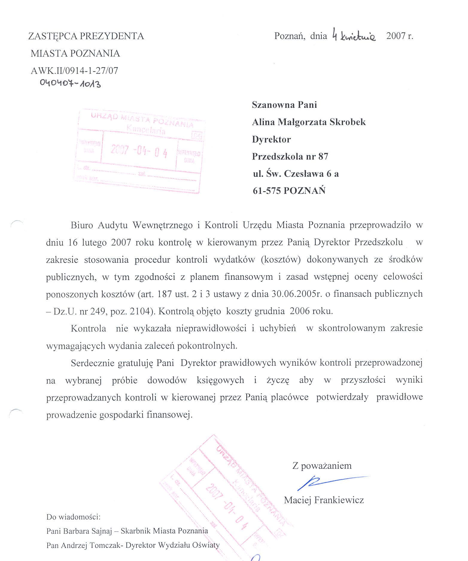 Informacja pobrana do BIP automatycznie z elektronicznego systemu zarządzania dokumentacją Urzędu Miasta Poznania.