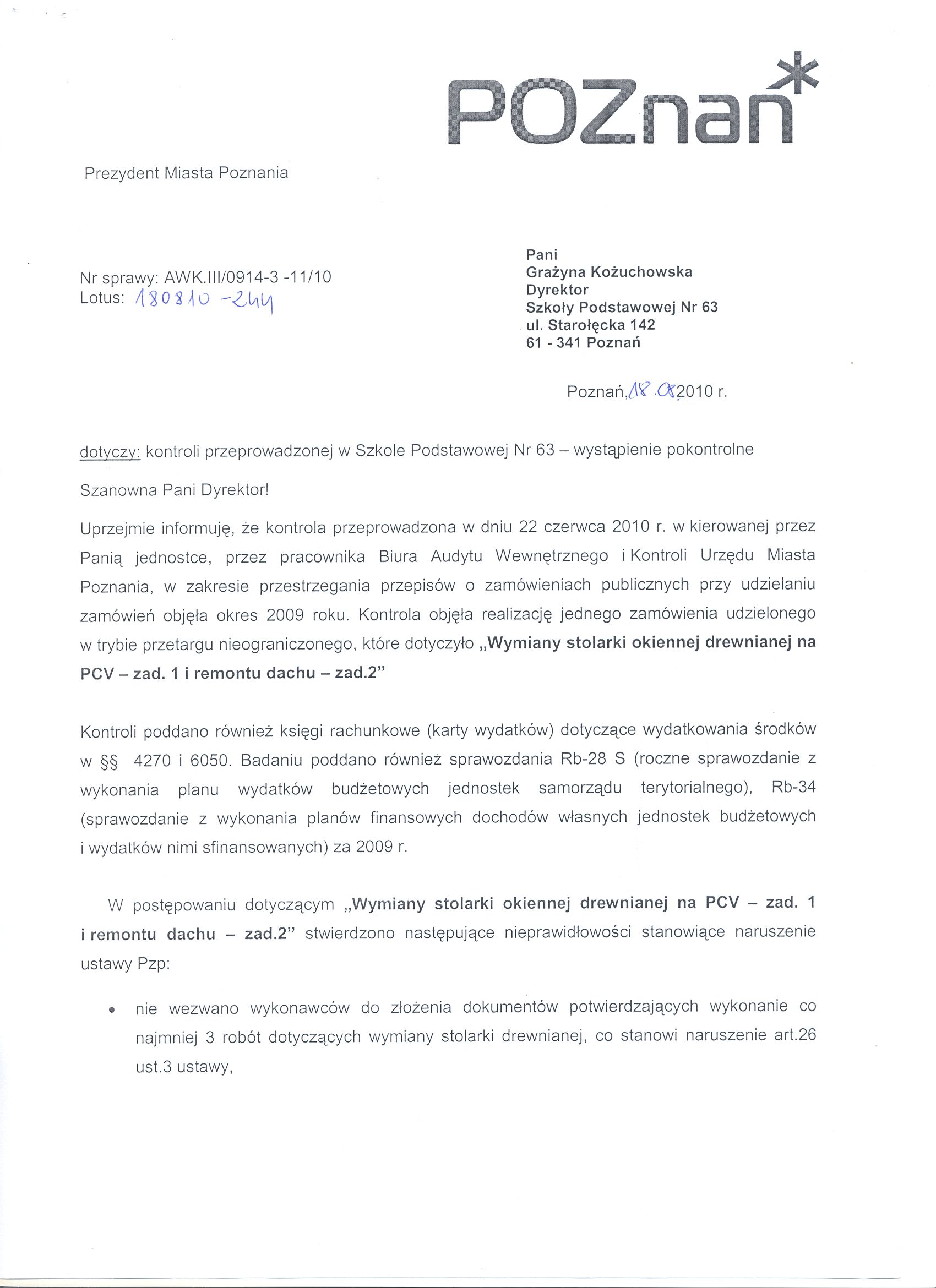 - zobowiązuję Panią Dyrektor do przeanalizowania poprawności funkcjonowania kontroli zarządczej w zakresie prawidłowego stosowania przepisów o zamówieniach publicznych, a w szczególności do: