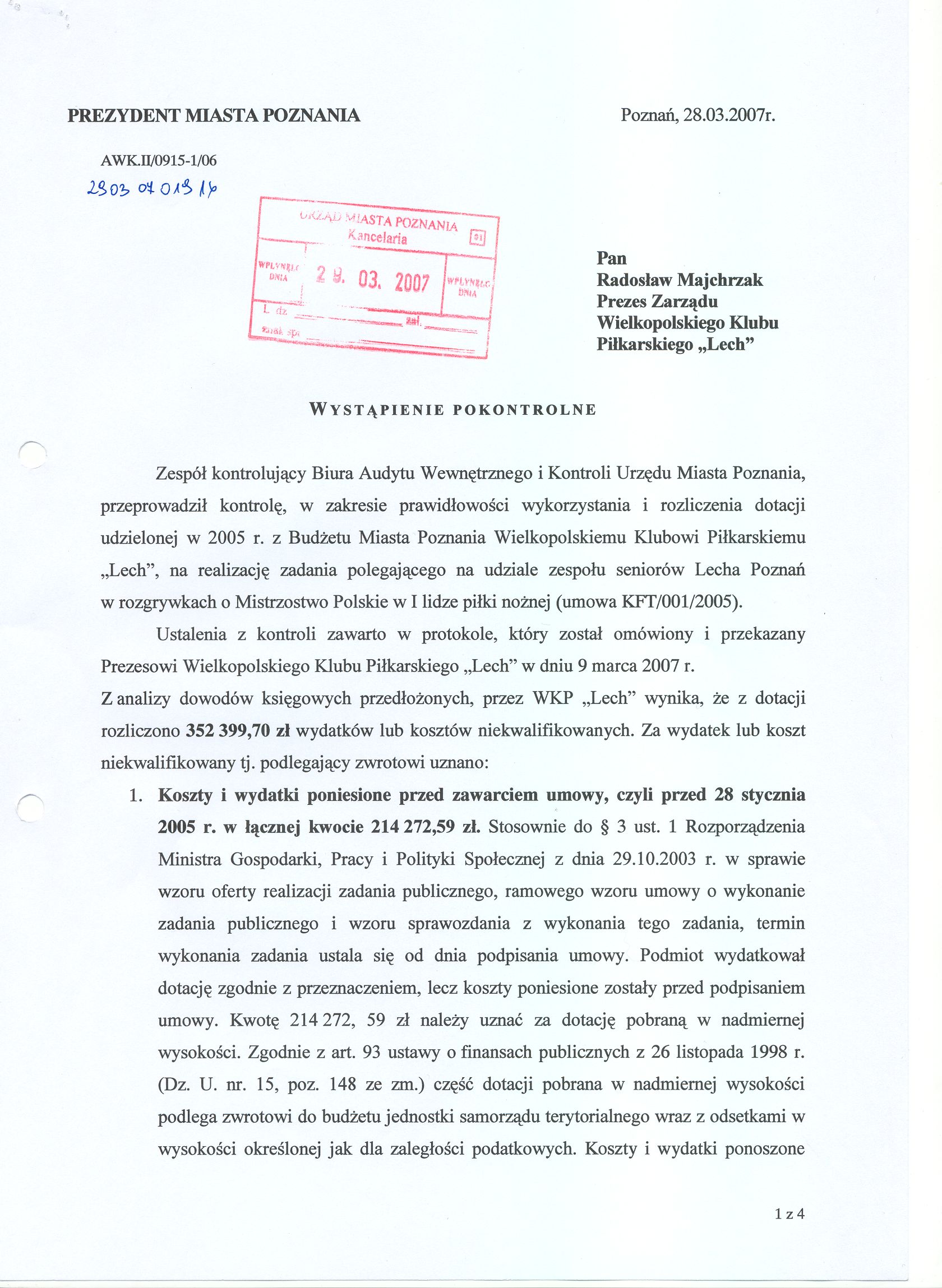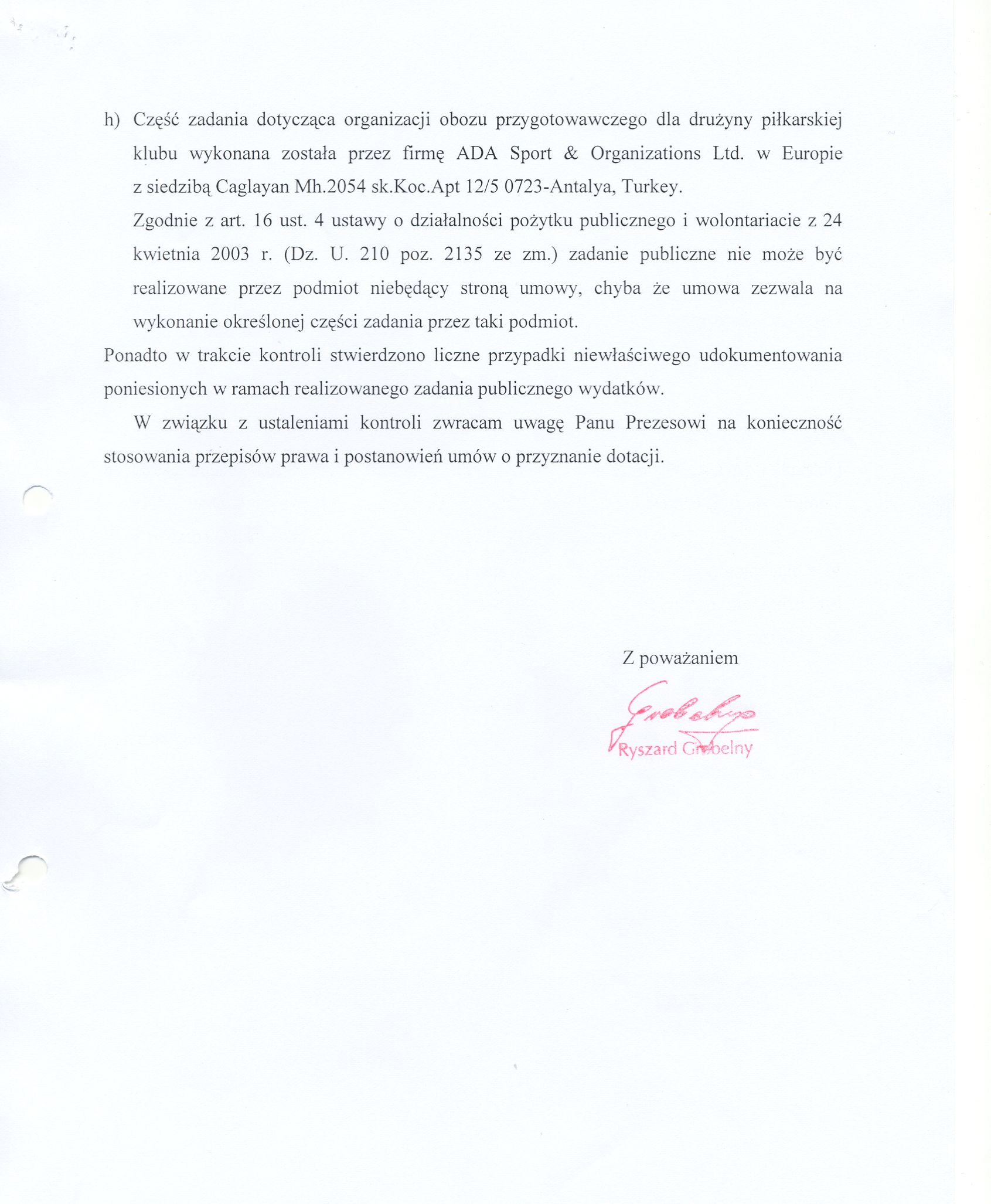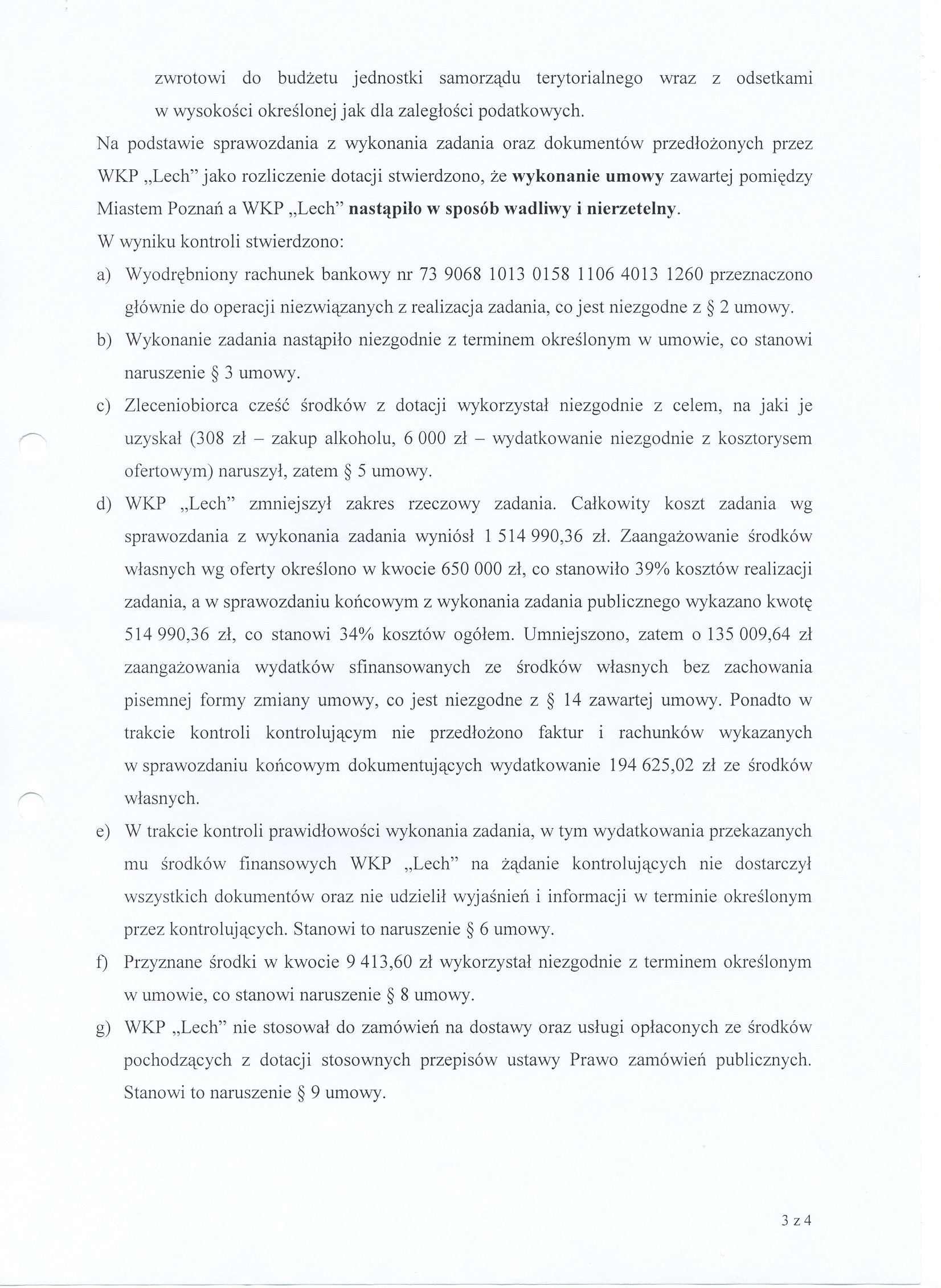 - W związku z ustaleniami kontroli zwrócono uwagę Panu Prezesowi WKP "Lech" Poznań na konieczność stosowania przepisów prawa i postanowień umów o przyznanie dotacji.