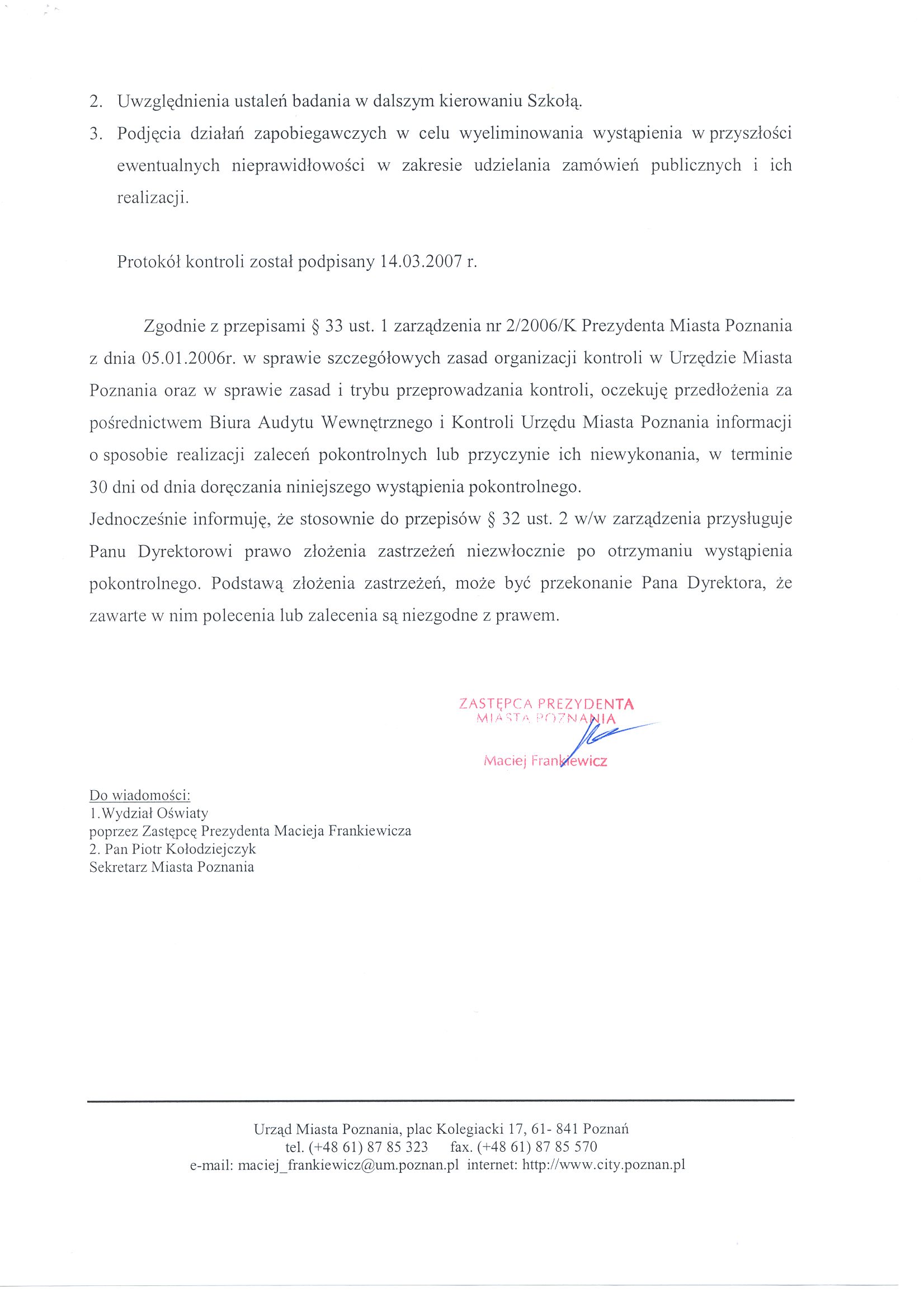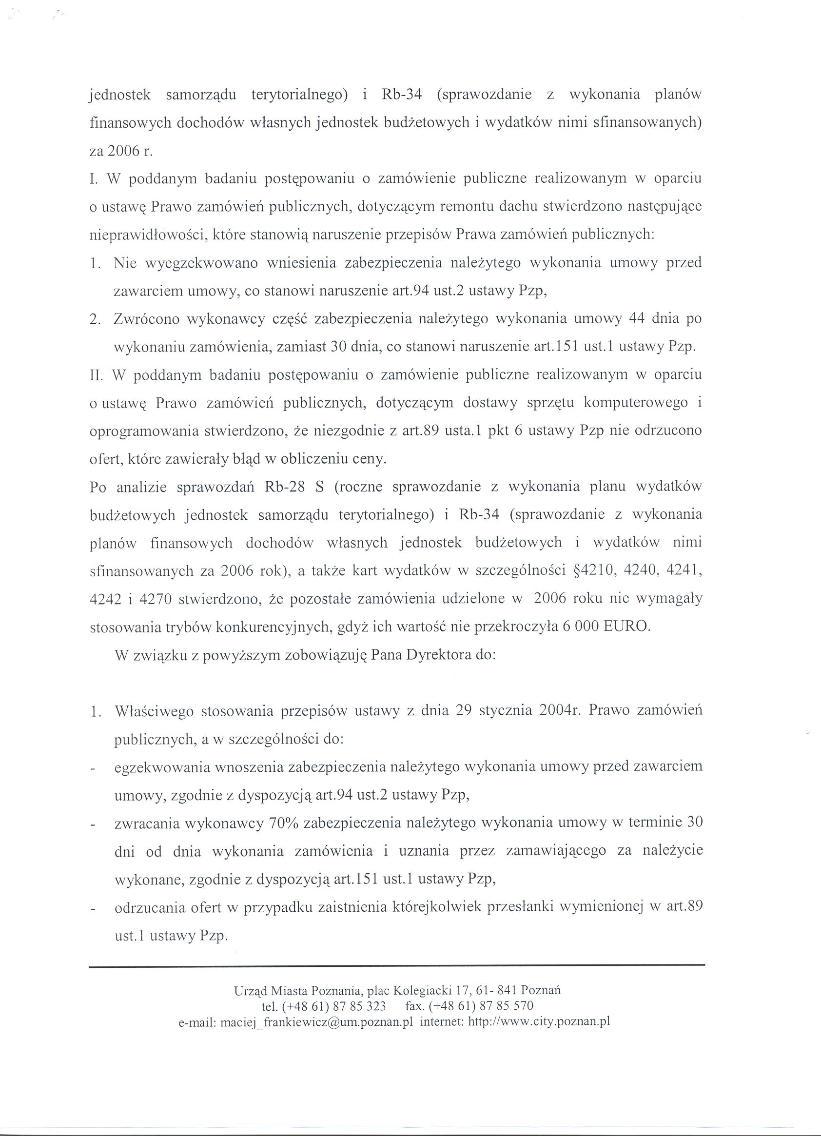 - Zastępca Prezydenta Pan Maciej Frankiewicz zobowiązał Dyrektora Zespołu Szkół Zawodowych nr 6 do: 1. Właściwego stosowania przepisów ustawy z dnia 29 stycznia 2004r. Prawo zamówień publicznych, a w szczególności do: