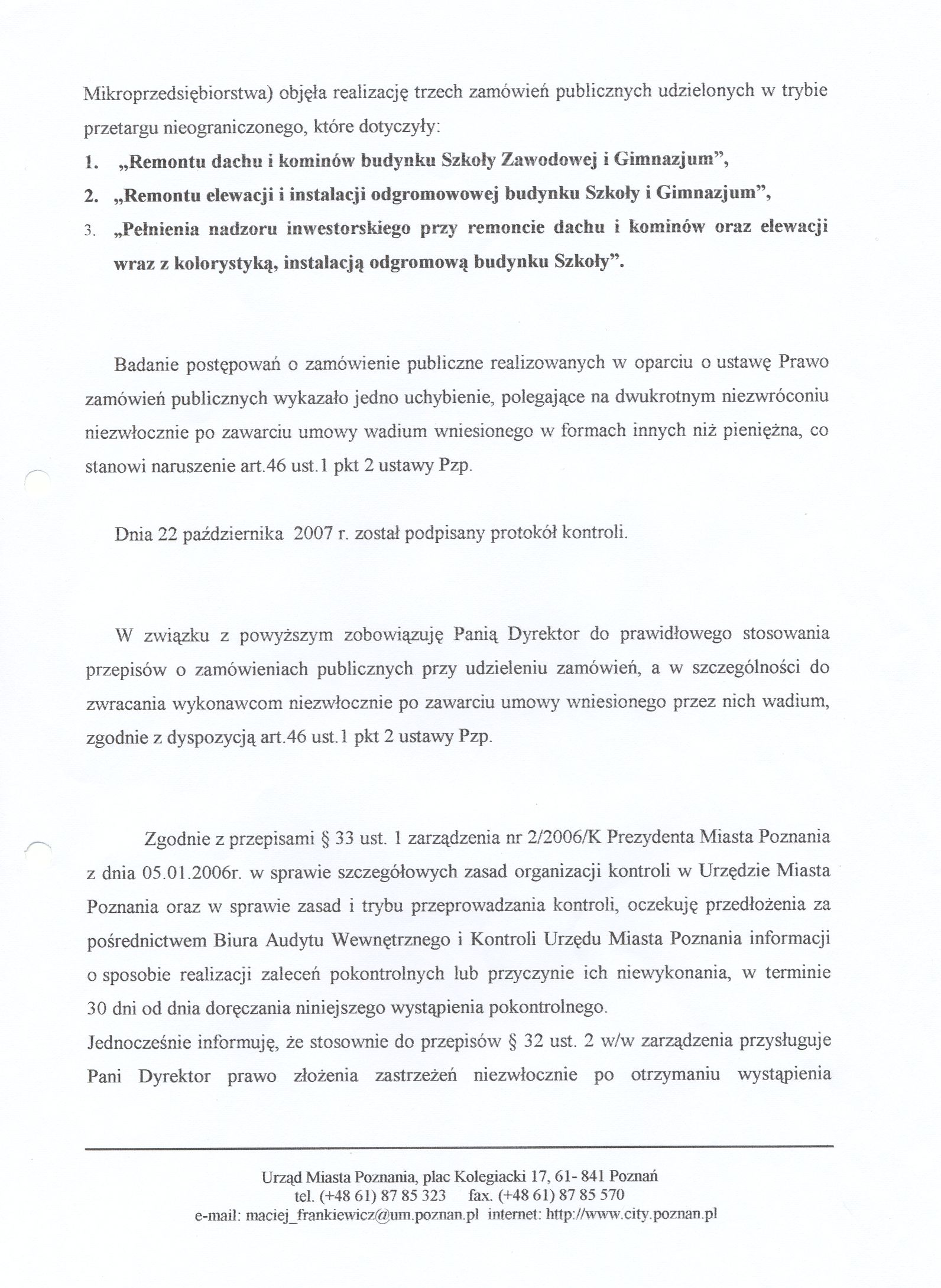 - Należy właściwie stosować przepisy ustawy Prawo zamówień publicznych przy udzialaniu zamówień, a w szczególności zwracać wykonawcom niezwłocznie po zawarciu umowy wniesione przez nich wadium, zgodnie z dyspozycją art.46 ust.1 pkt 2 ustawy.