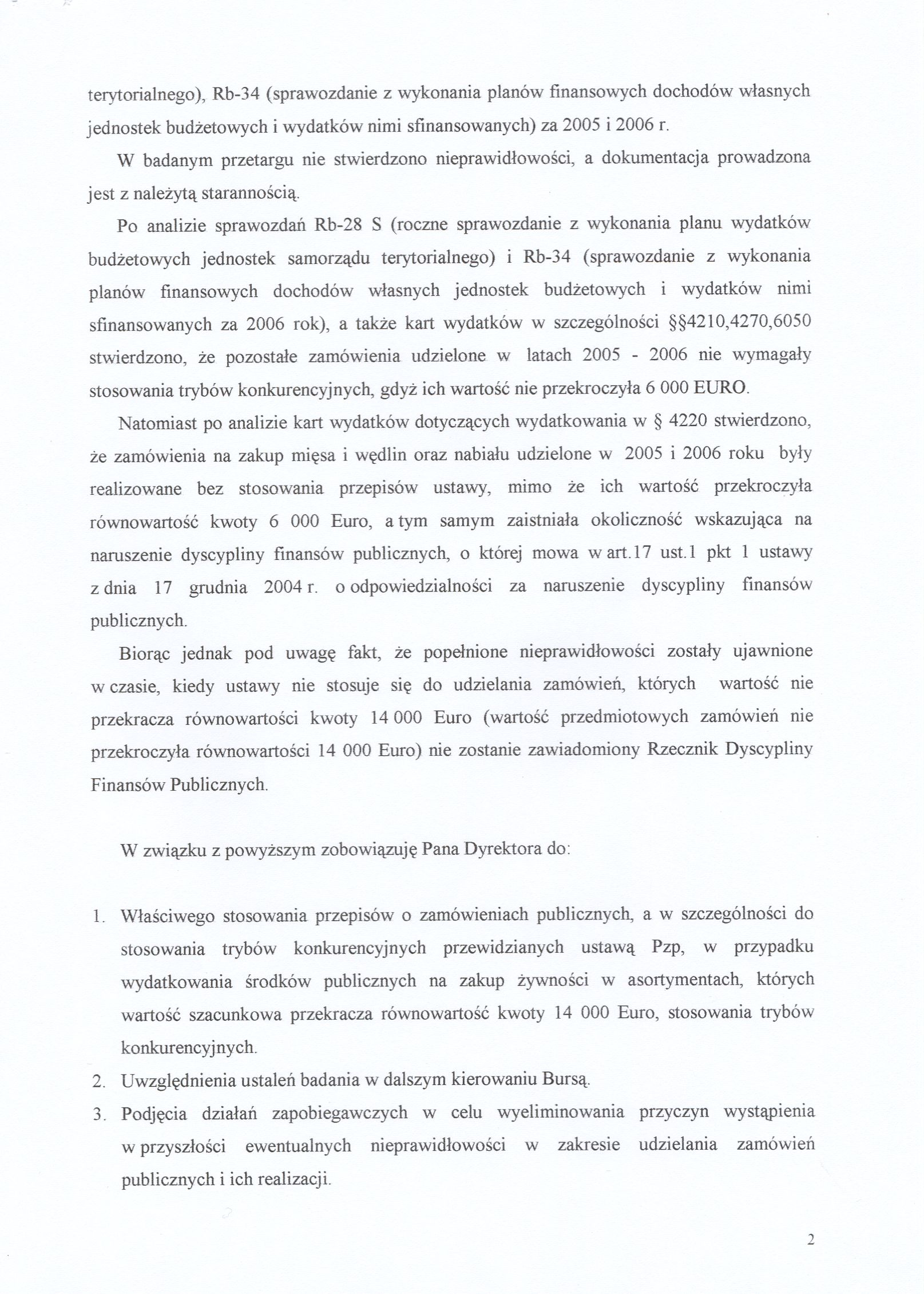 - 1. Należy właściwie stosować przepisy o zamówieniach publicznych, a w szczególności zobowiązano dyrektora Bursy do stosowania trybów konkurencyjnych przewidzianych ustawą Pzp, w przypadku wydatkowania środków publicznych na zakup żywności w asortymentach, których wartość szacunkowa przekracza równowartość kwoty 14 000 Euro, stosowania trybów konkurencyjnych.