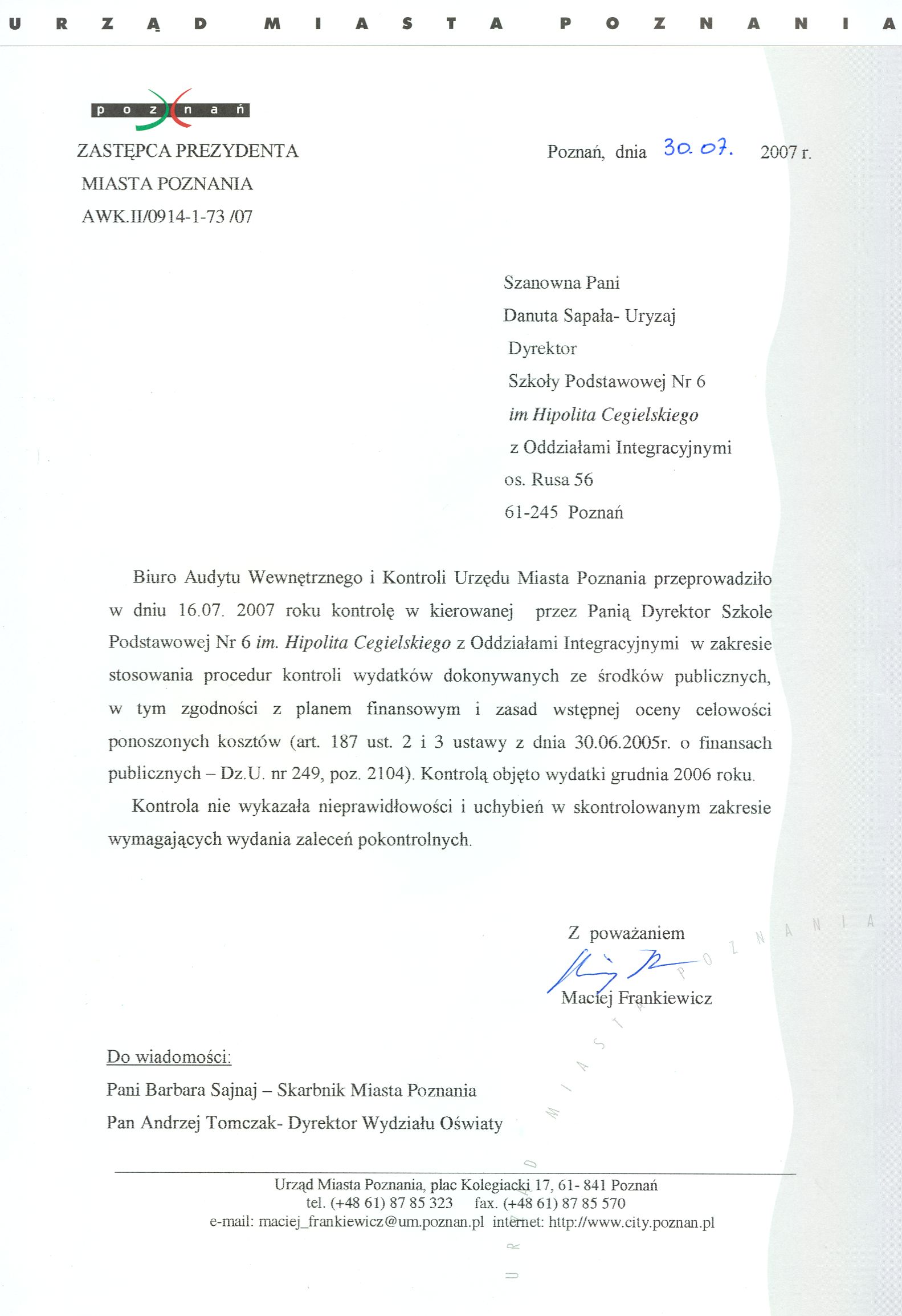 Informacja pobrana do BIP automatycznie z elektronicznego systemu zarządzania dokumentacją Urzędu Miasta Poznania.