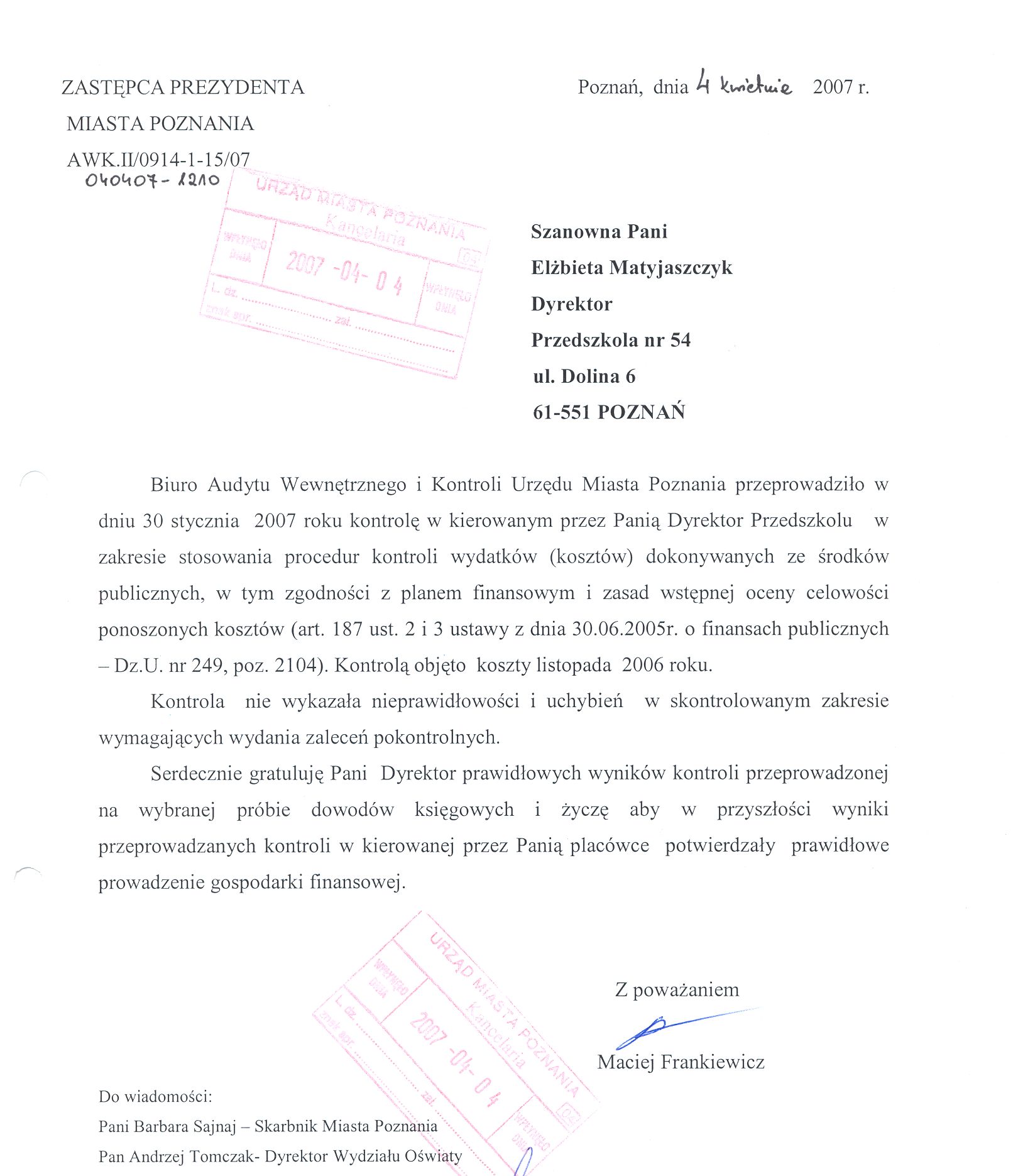 Informacja pobrana do BIP automatycznie z elektronicznego systemu zarządzania dokumentacją Urzędu Miasta Poznania.