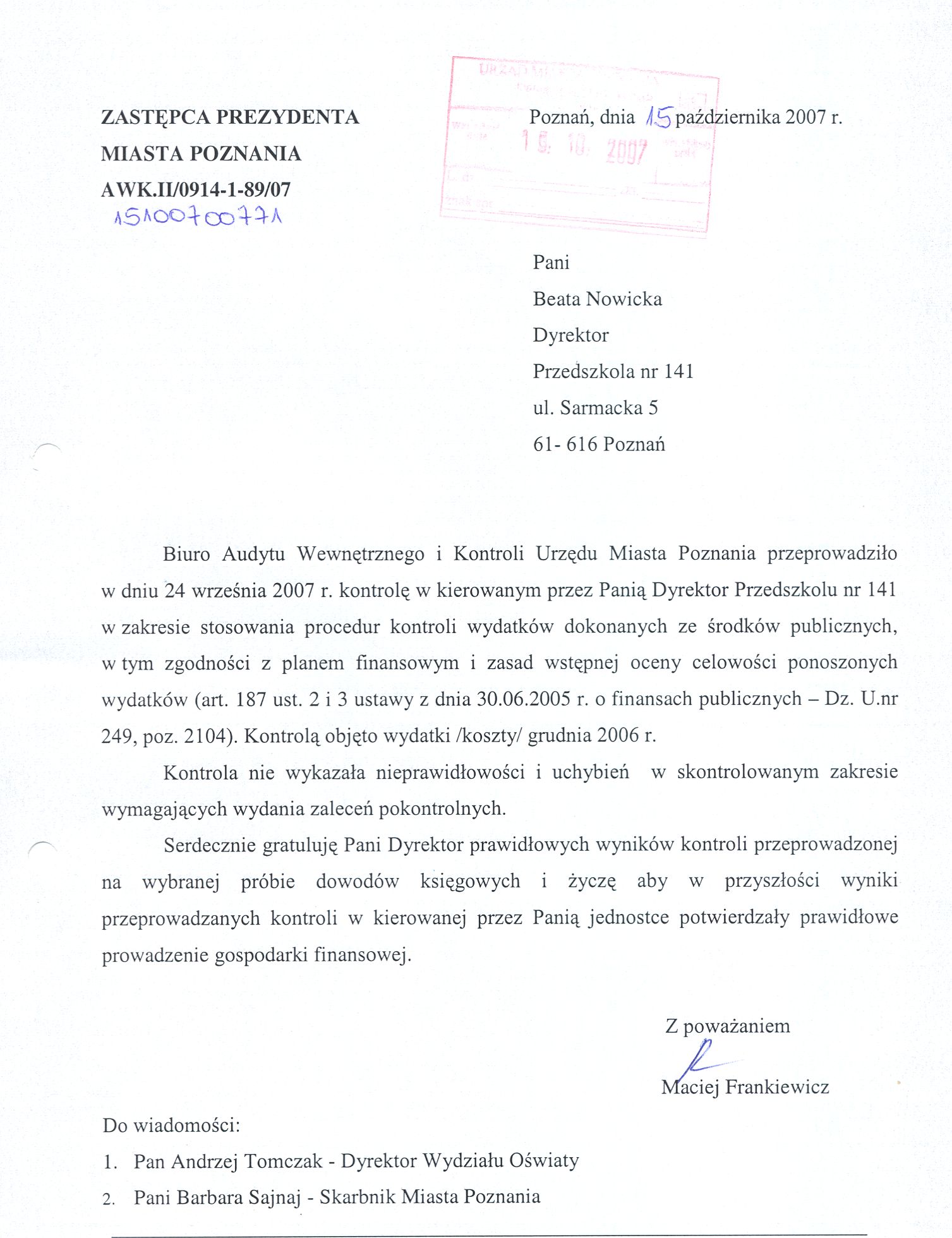Informacja pobrana do BIP automatycznie z elektronicznego systemu zarządzania dokumentacją Urzędu Miasta Poznania.