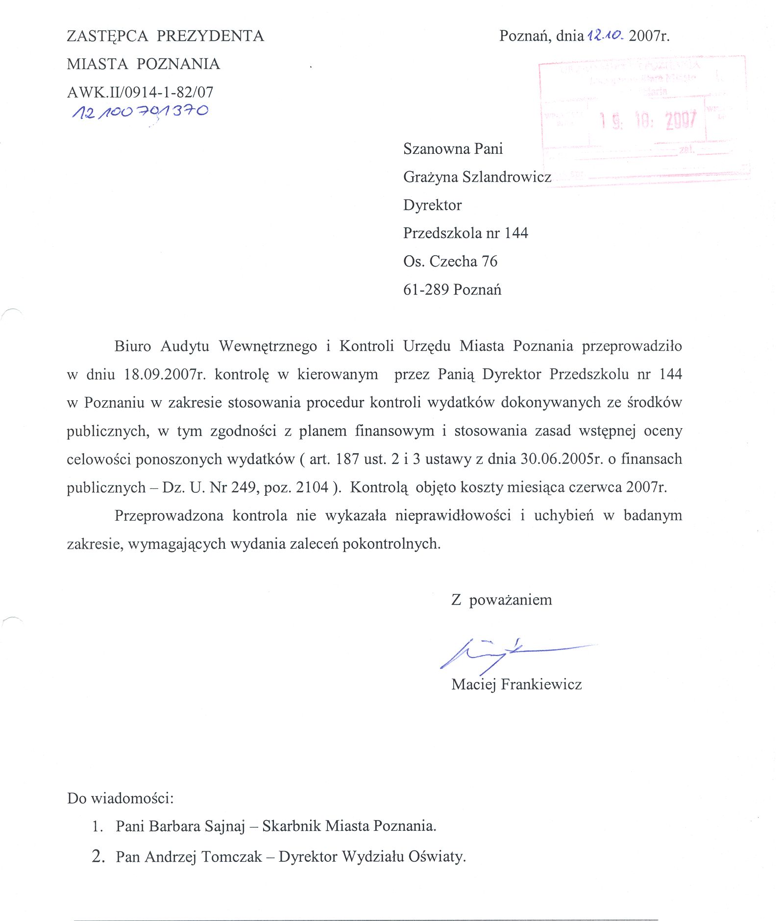 Informacja pobrana do BIP automatycznie z elektronicznego systemu zarządzania dokumentacją Urzędu Miasta Poznania.