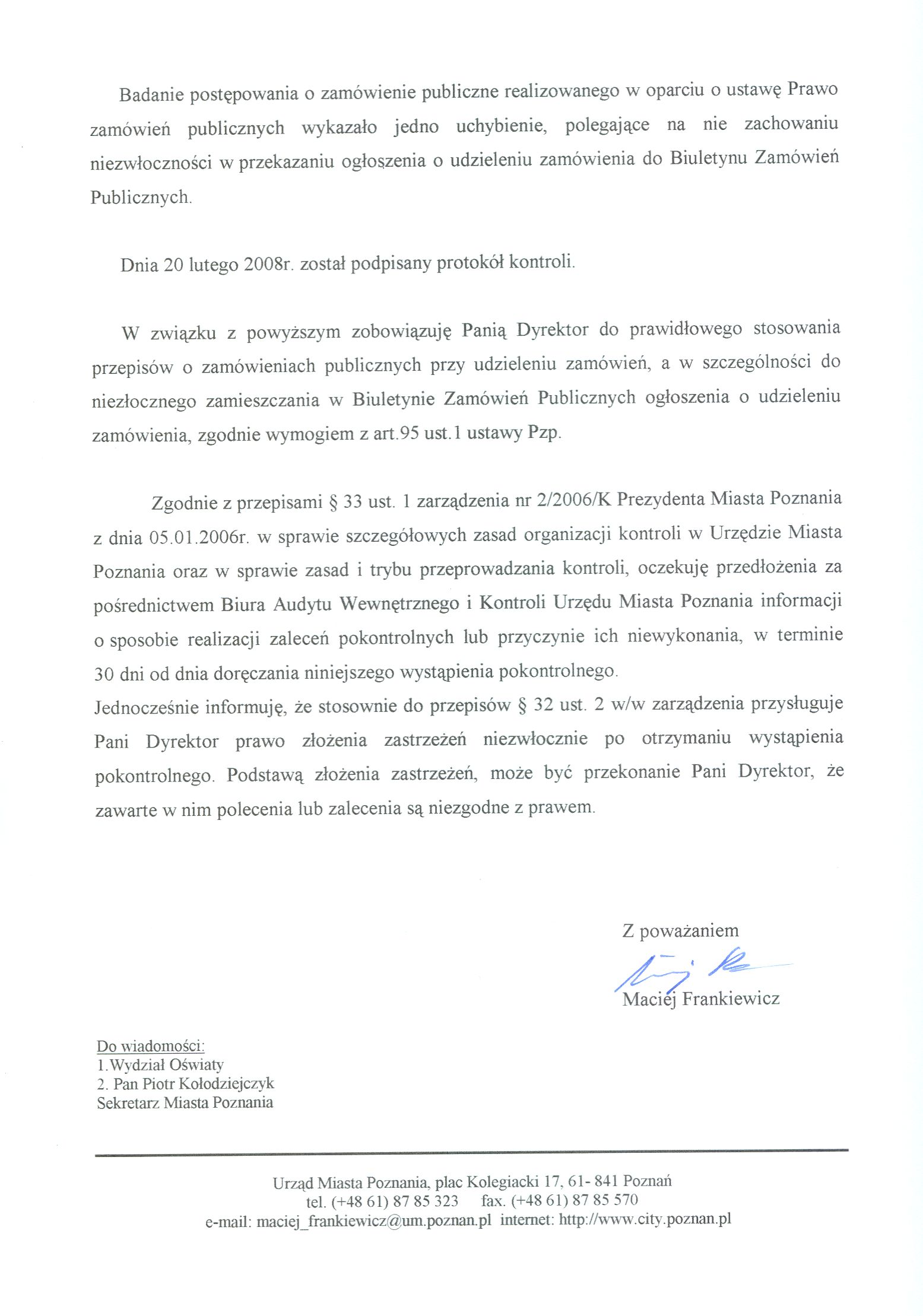 - Zobowiązanie Pani Dyrektor do prawidłowego stosowania przepisów o zamówieniach publicznych przy udzieleniu zamówień, a w szczególności do niezłocznego zamieszczania w Biuletynie Zamówień Publicznych ogłoszenia o udzieleniu zamówienia, zgodnie wymogiem z art.95 ust.1 ustawy Pzp