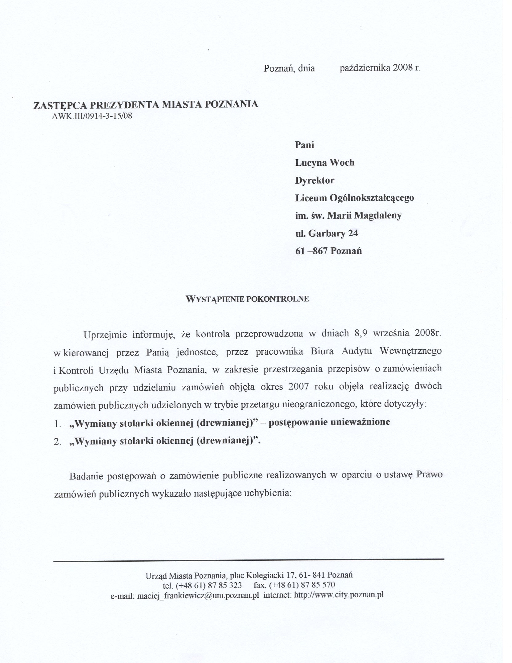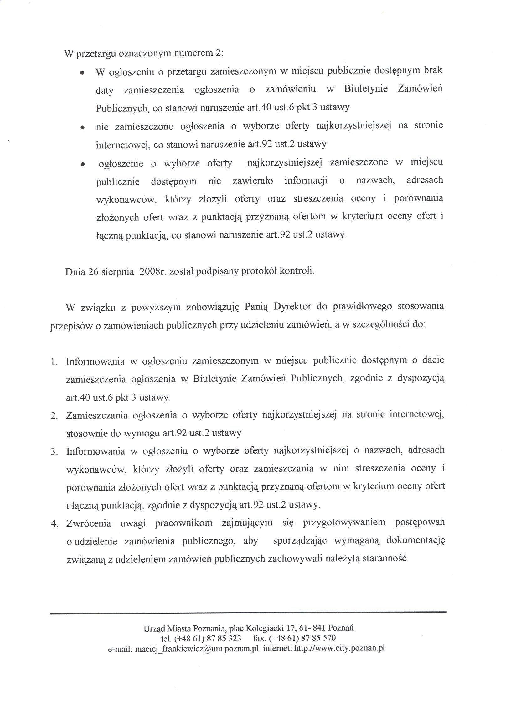 - 4. Zwrócenia uwagi pracownikom zajmującym się przygotowywaniem postępowań o udzielenie zamówienia publicznego, aby sporządzając wymaganą dokumentację związaną z udzieleniem zamówień publicznych zachowywali należytą staranność.