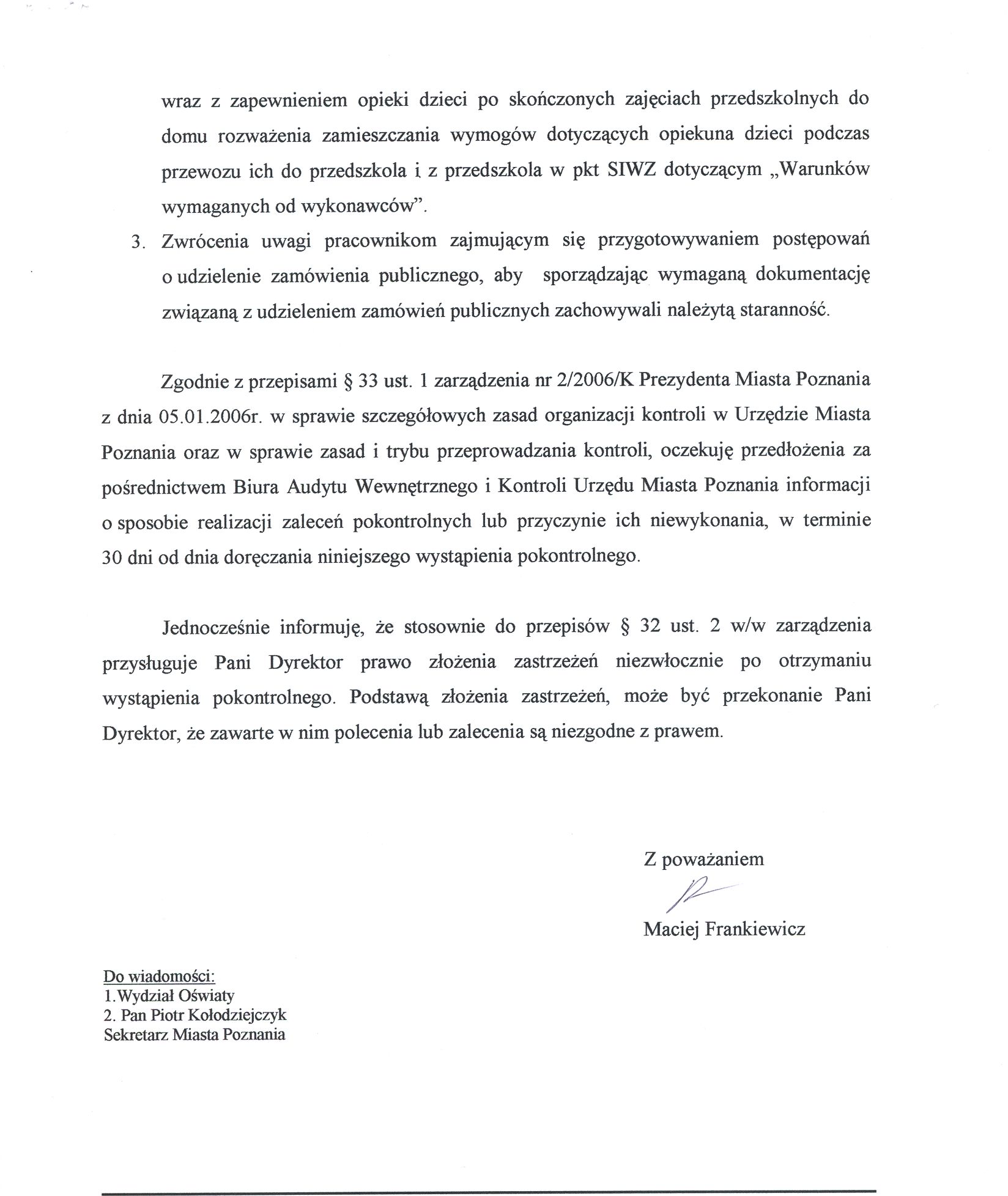 - 3. Zwrócenia uwagi pracownikom zajmującym się przygotowywaniem postępowań o udzielenie zamówienia publicznego, aby sporządzając wymaganą dokumentację związaną z udzieleniem zamówień publicznych zachowywali należytą staranność.