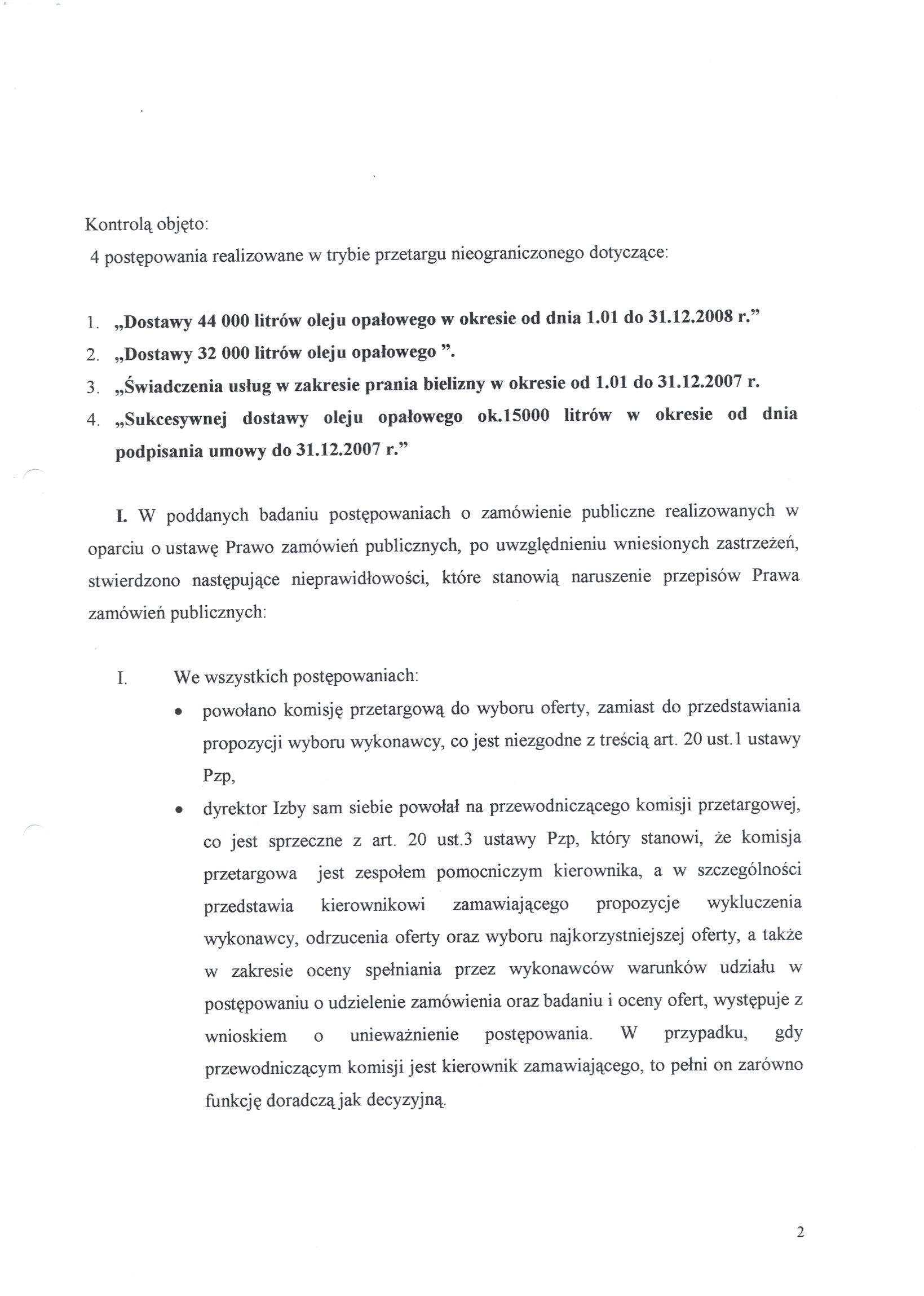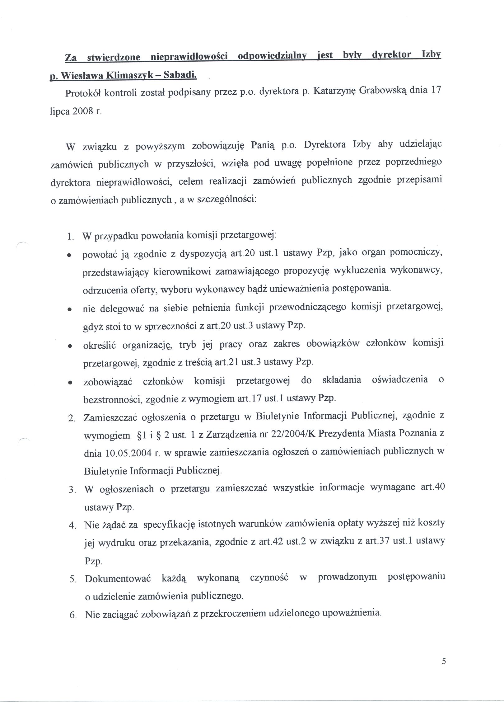 - Zobowiązanie p.o. Dyrektora Izby do aby udzielając zamówień publicznych w przyszłości, wzięła pod uwagę popełnione przez poprzedniego dyrektora nieprawidłowości, celem realizacji zamówień publicznych zgodnie przepisami o zamówieniach publicznych , a w szczególności: