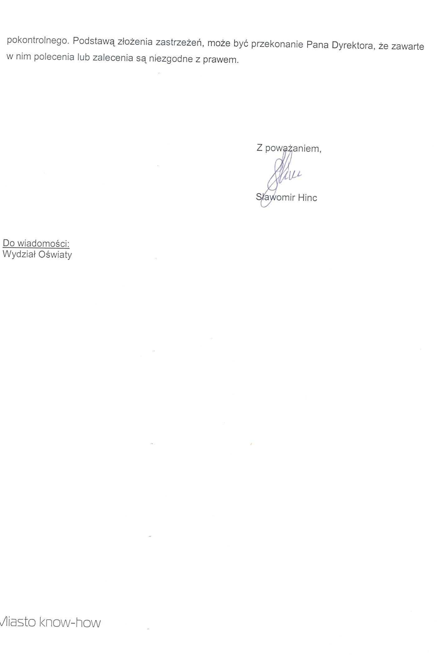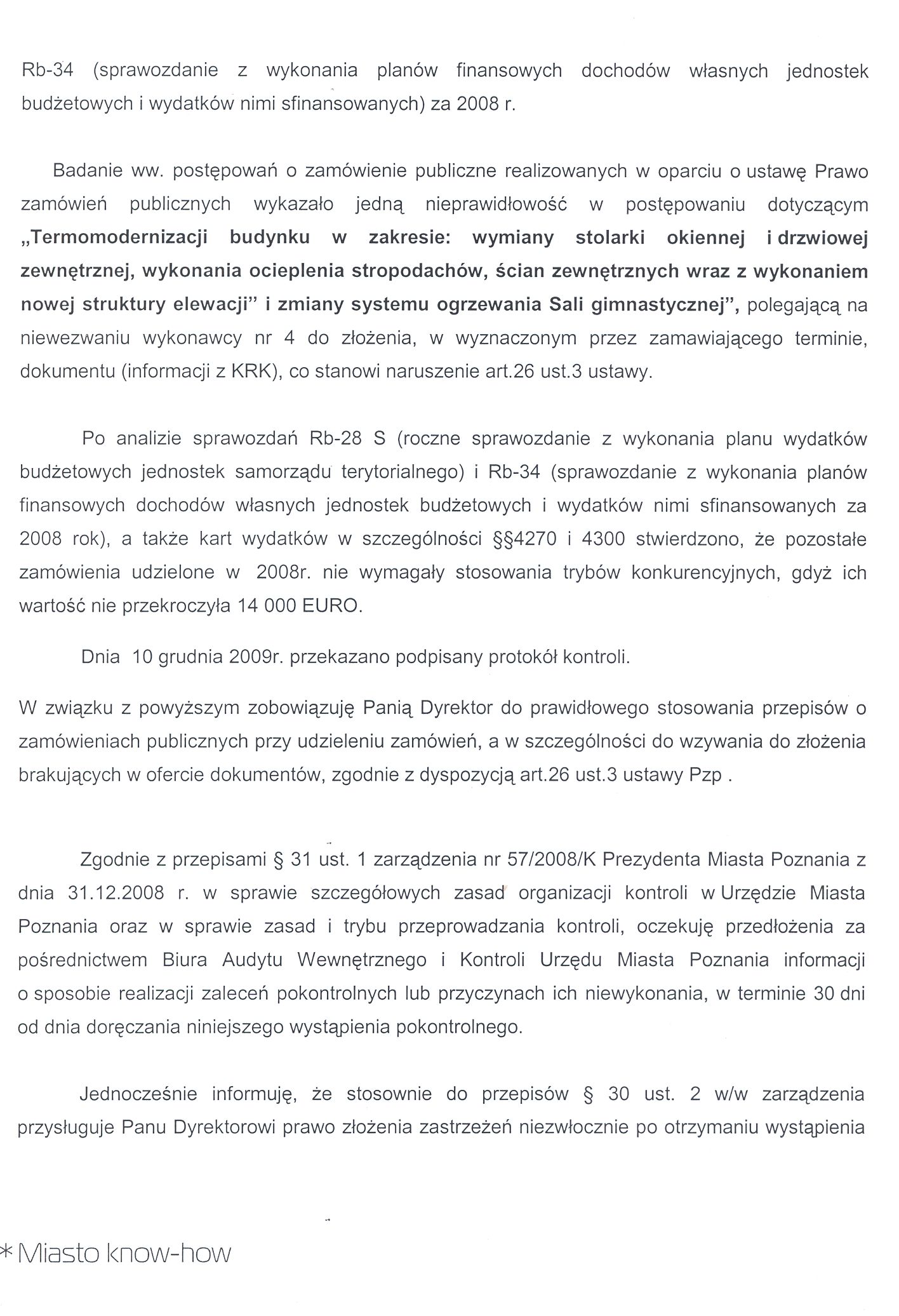 - Zobowiązanie Pani Dyrektor do prawidłowego stosowania przepisów o zamówieniach publicznych przy udzieleniu zamówień, a w szczególności do wzywania do złożenia brakujących w ofercie dokumentów, zgodnie z dyspozycją art.26 ust.3 ustawy Pzp .