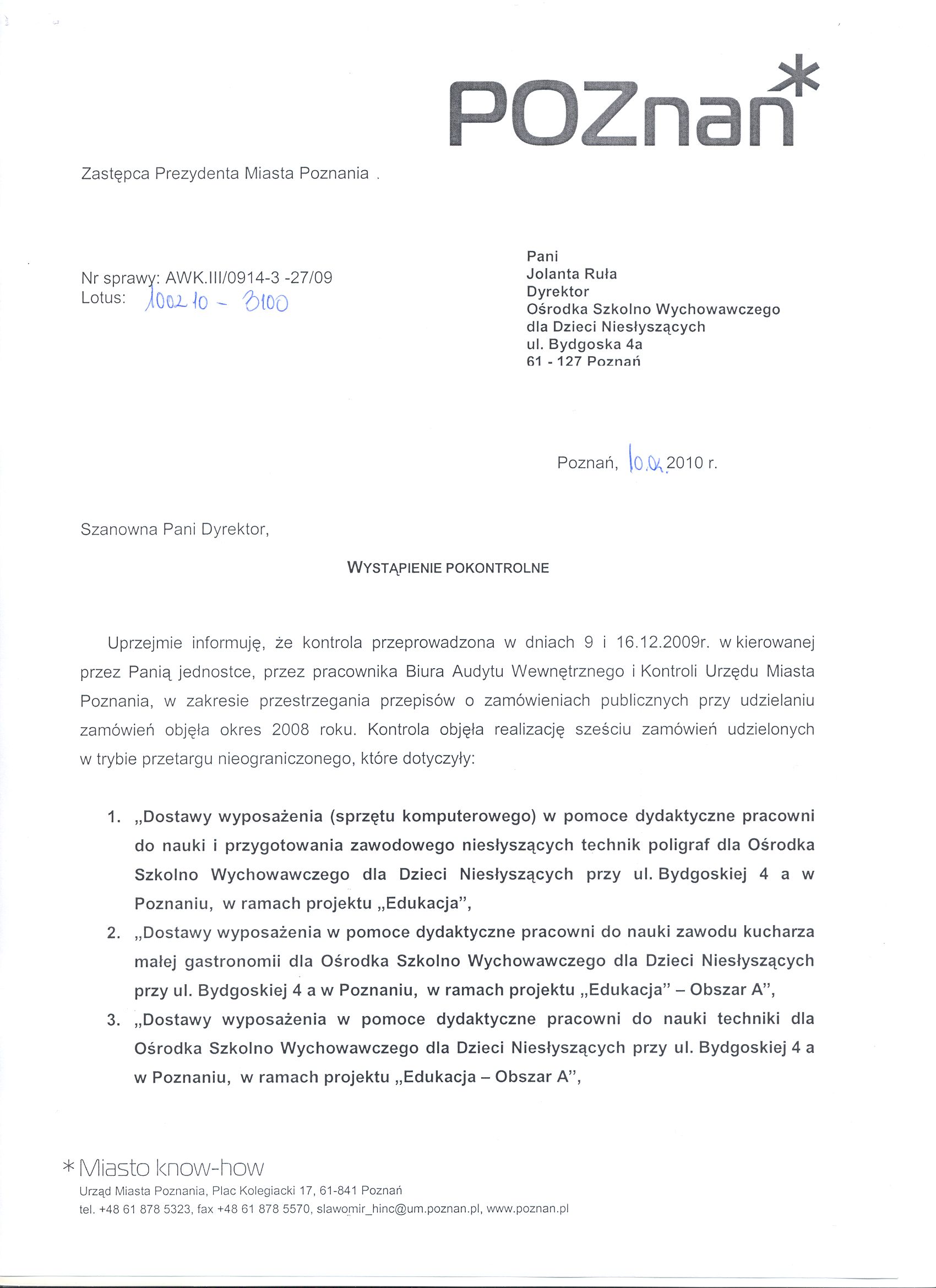 - Zobowiązanie Pani Dyrektor do prawidłowego stosowania przepisów o zamówieniach publicznych przy udzieleniu zamówień, a w szczególności do: