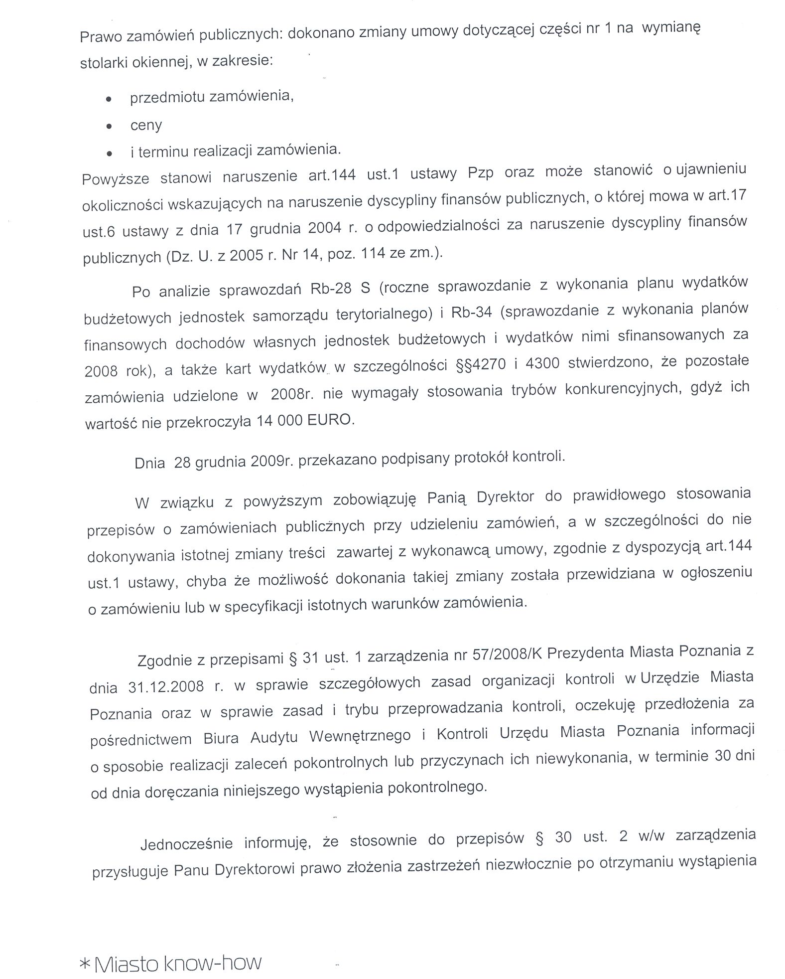 - Zobowiązanie Pani Dyrektor do prawidłowego stosowania przepisów o zamówieniach publicznych przy udzieleniu zamówień, a w szczególności do nie dokonywania istotnej zmiany treści zawartej z wykonawcą umowy, zgodnie z dyspozycją art.144 ust.1 ustawy, chyba że możliwość dokonania takiej zmiany została przewidziana w ogłoszeniu o zamówieniu lub w specyfikacji istotnych warunków zamówienia.