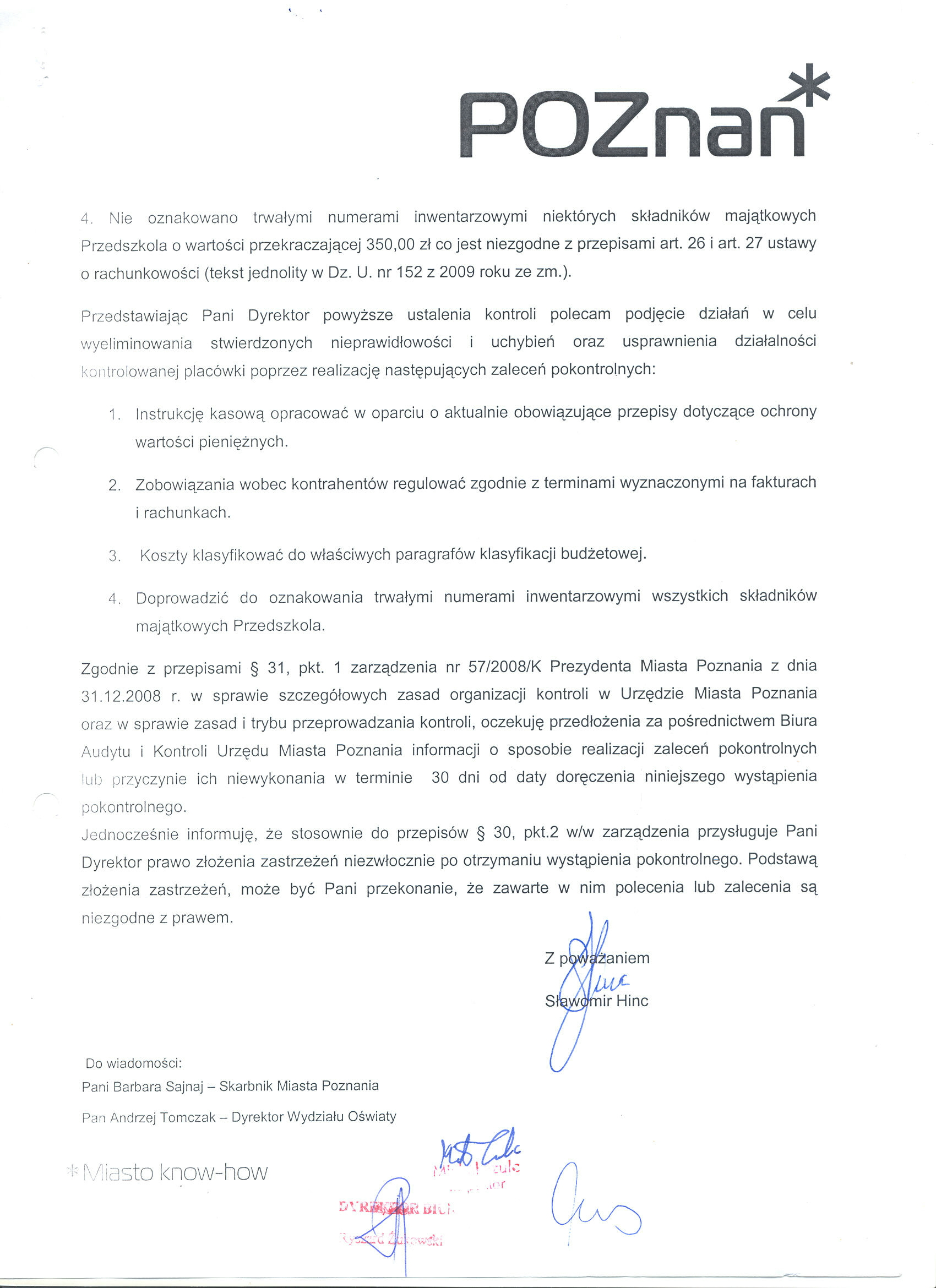 - 4.Doprowadzić do oznakowania trwałymi numerami inwentarzowymi wszystkich składników majątkowych Przedszkola.