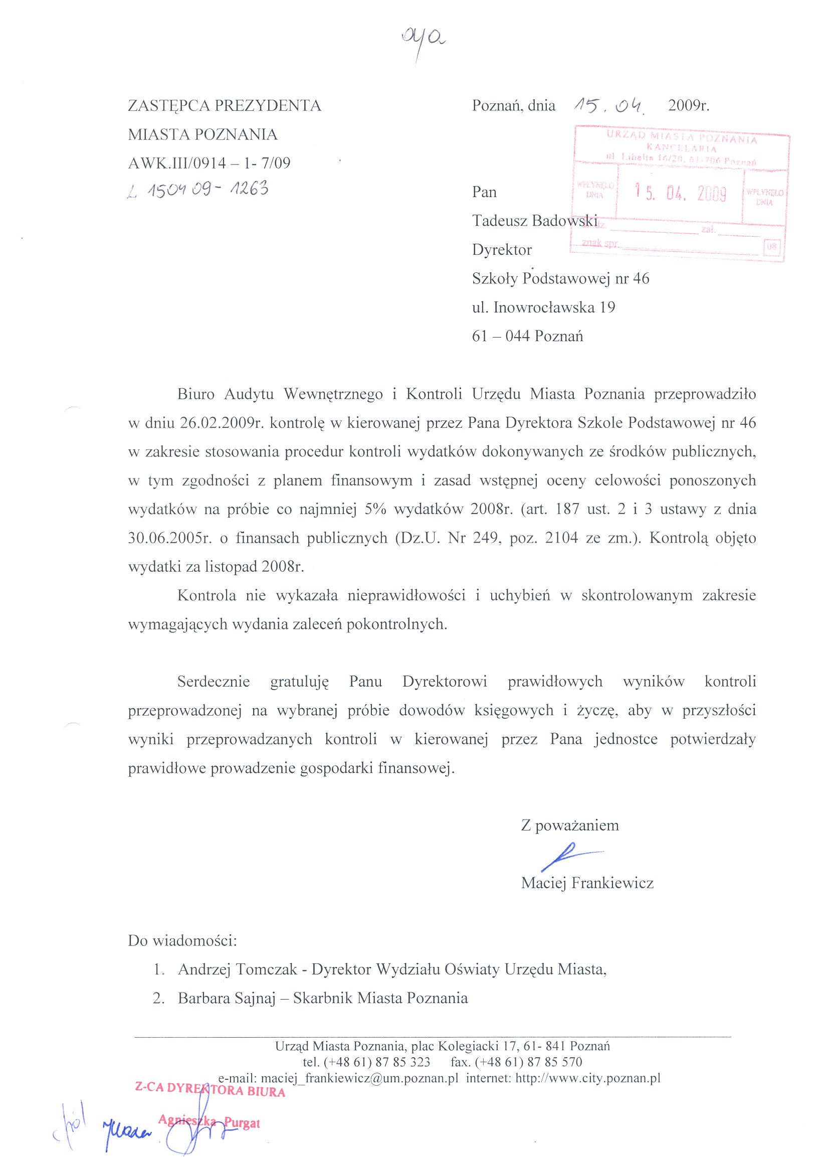- nie wydano zaleceń pismo informujace o wynikach kontroli w załączeniu