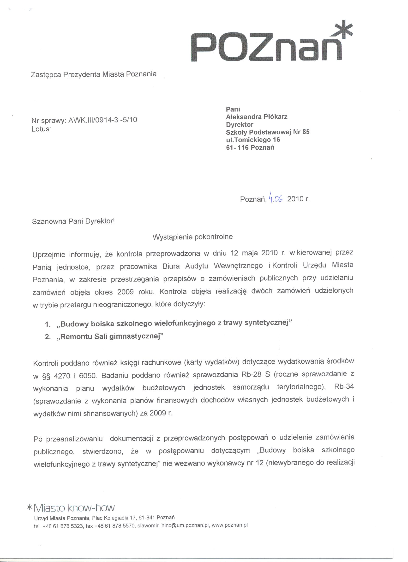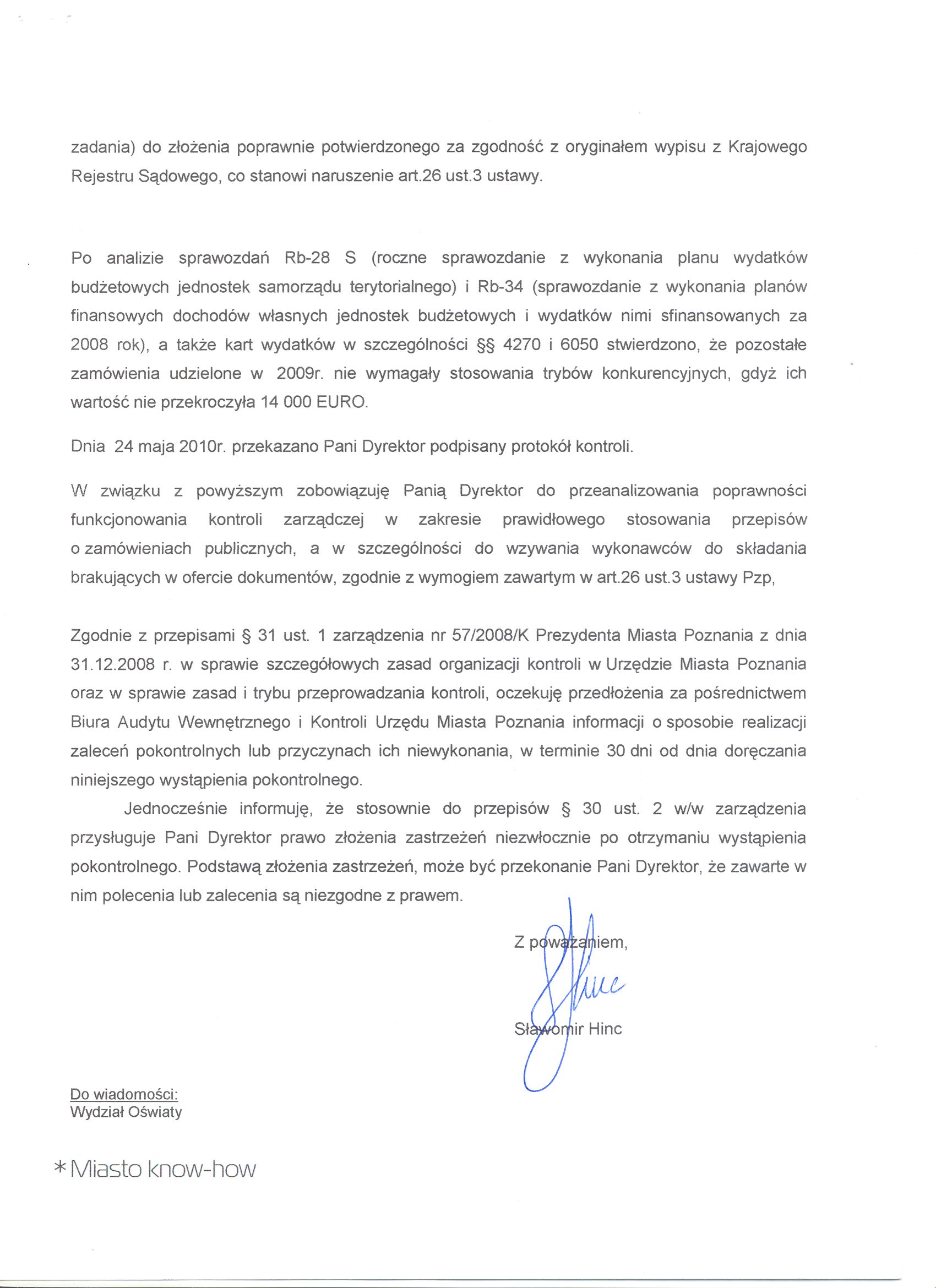- Zobowiązanie Panii Dyrektor do przeanalizowania poprawności funkcjonowania kontroli zarządczej w zakresie prawidłowego stosowania przepisów o zamówieniach publicznych, a w szczególności do wzywania wykonawców do składania brakujących w ofercie dokumentów, zgodnie z wymogiem zawartym w art.26 ust.3 ustawy Pzp,
