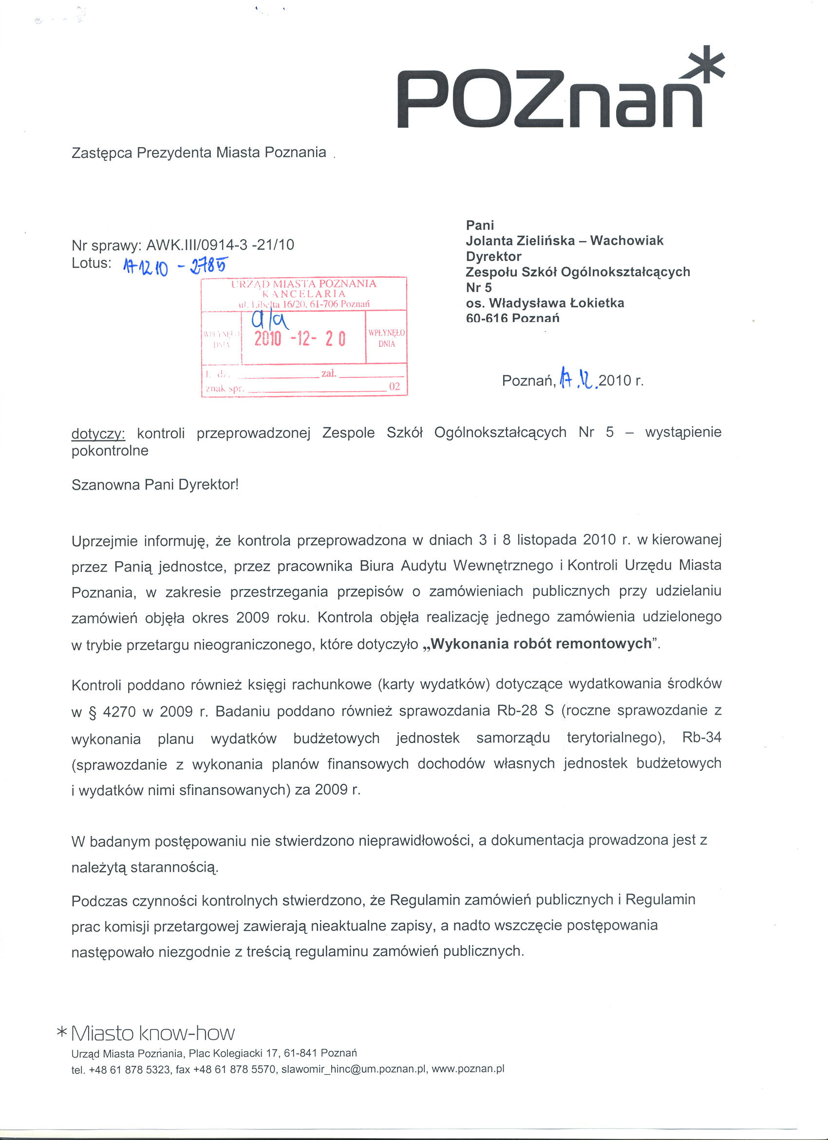 - Zobowiązanie Pani Dyrektor do przeanalizowania poprawności funkcjonowania kontroli zarządczej w zakresie aktualności zapisów znajdujących się w aktach wewnętrznych Szkoły, a w szczególności do zaktualizowania zapisów znajdujących się w Regulaminie zamówień publicznych i Regulaminie prac komisji przetargowej.