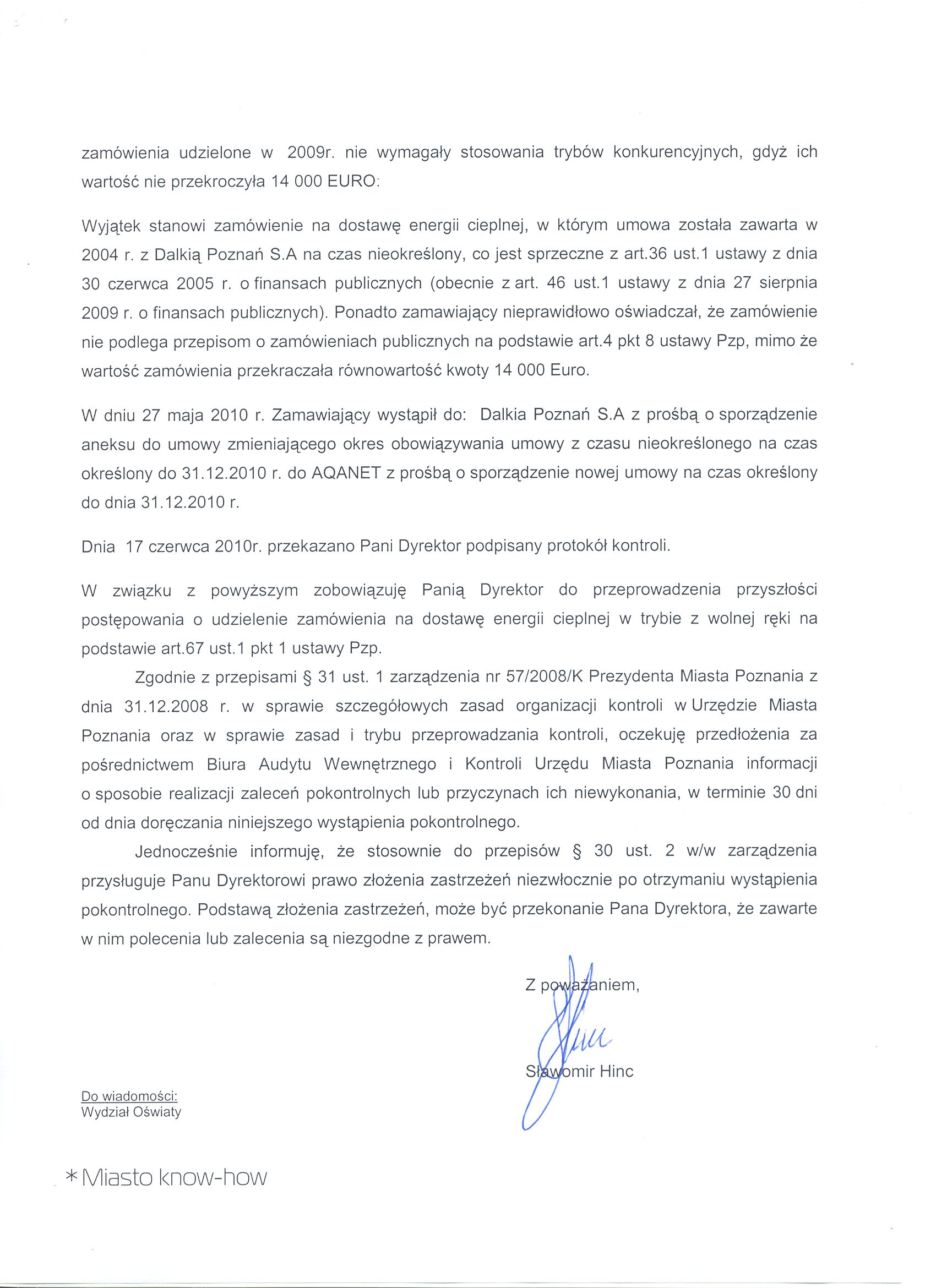 - Zobowiązanie Pani Dyrektor do przeprowadzenia przyszłości postępowania o udzielenie zamówienia na dostawę energii cieplnej w trybie z wolnej ręki na podstawie art.67 ust.1 pkt 1 ustawy Pzp.