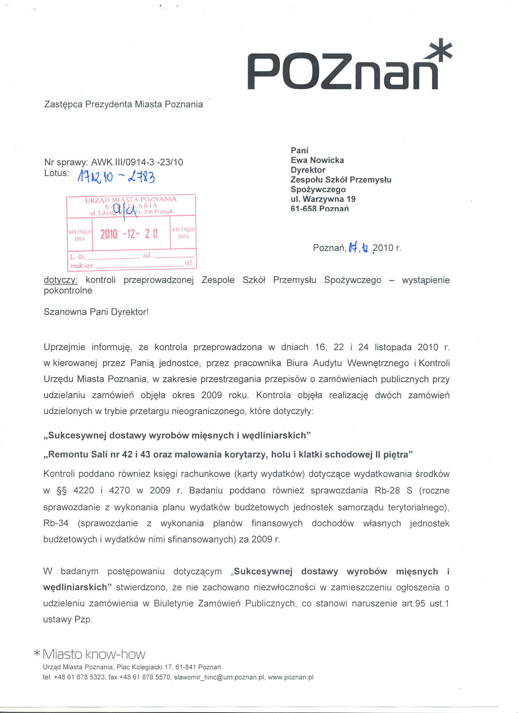 - Ponadto zobowiązuję Panią Dyrektor do zwrócenia uwagi pracownikowi zajmującemu się realizacją umów, zawartych w wyniku postępowania o udzielenie zamówienia publicznego do wpisywania w umowie wszystkich wymaganych treści.