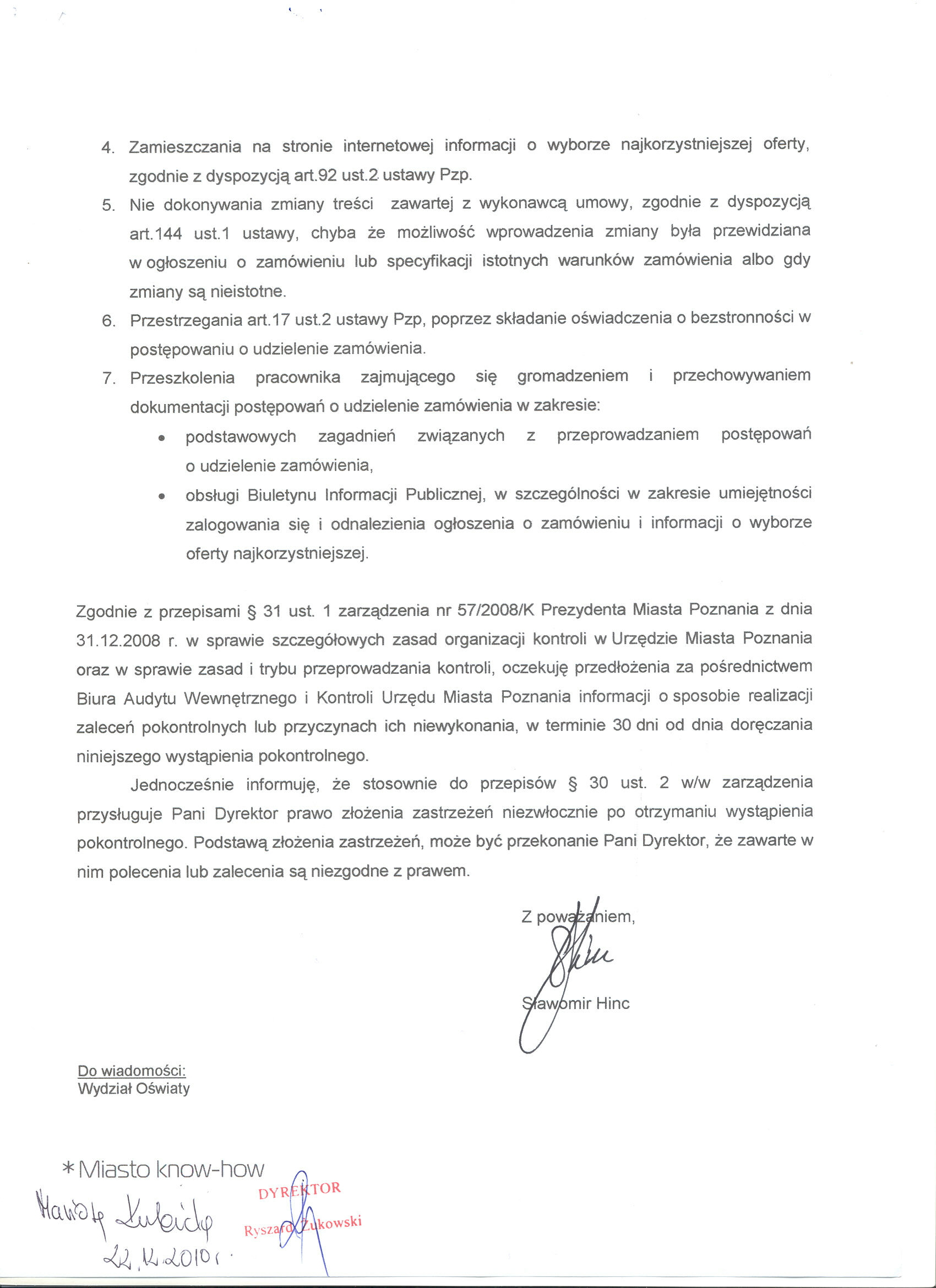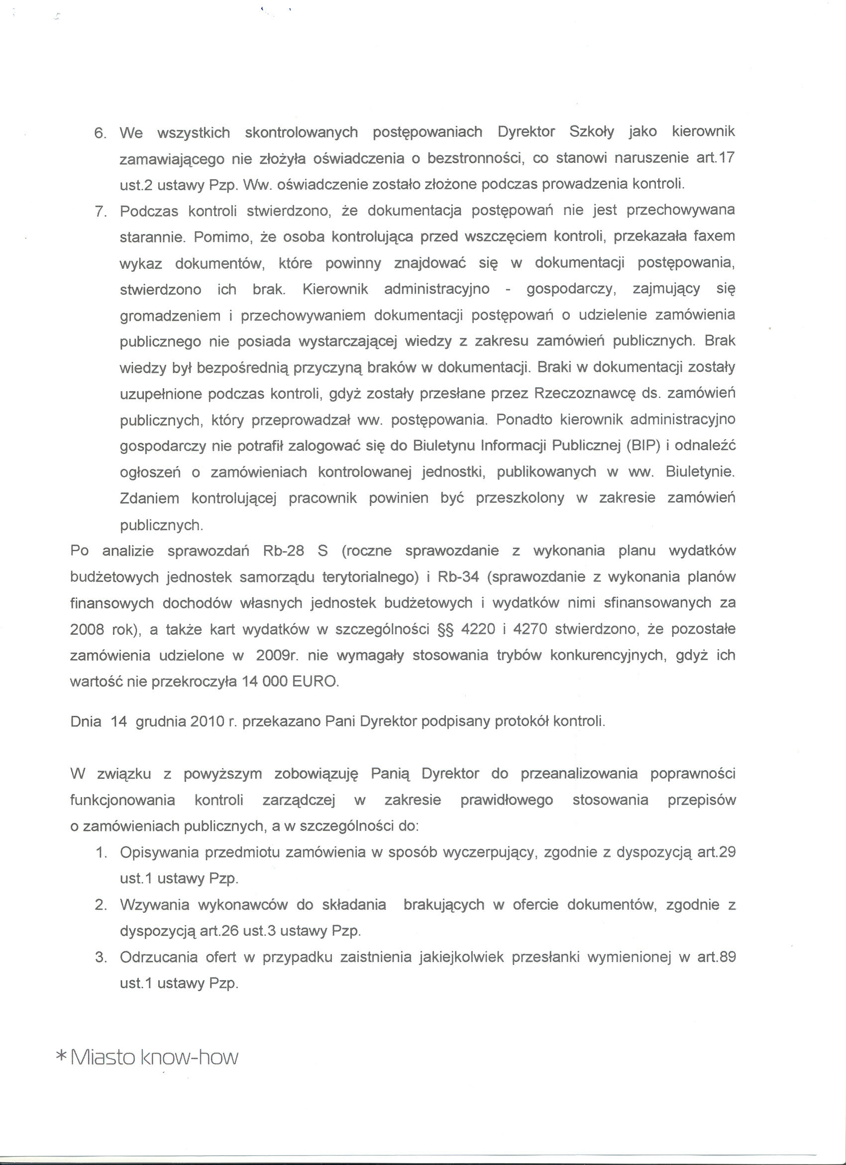 - Zobowiązuanie Pani Dyrektor do przeanalizowania poprawności funkcjonowania kontroli zarządczej w zakresie prawidłowego stosowania przepisów o zamówieniach publicznych, a w szczególności do: