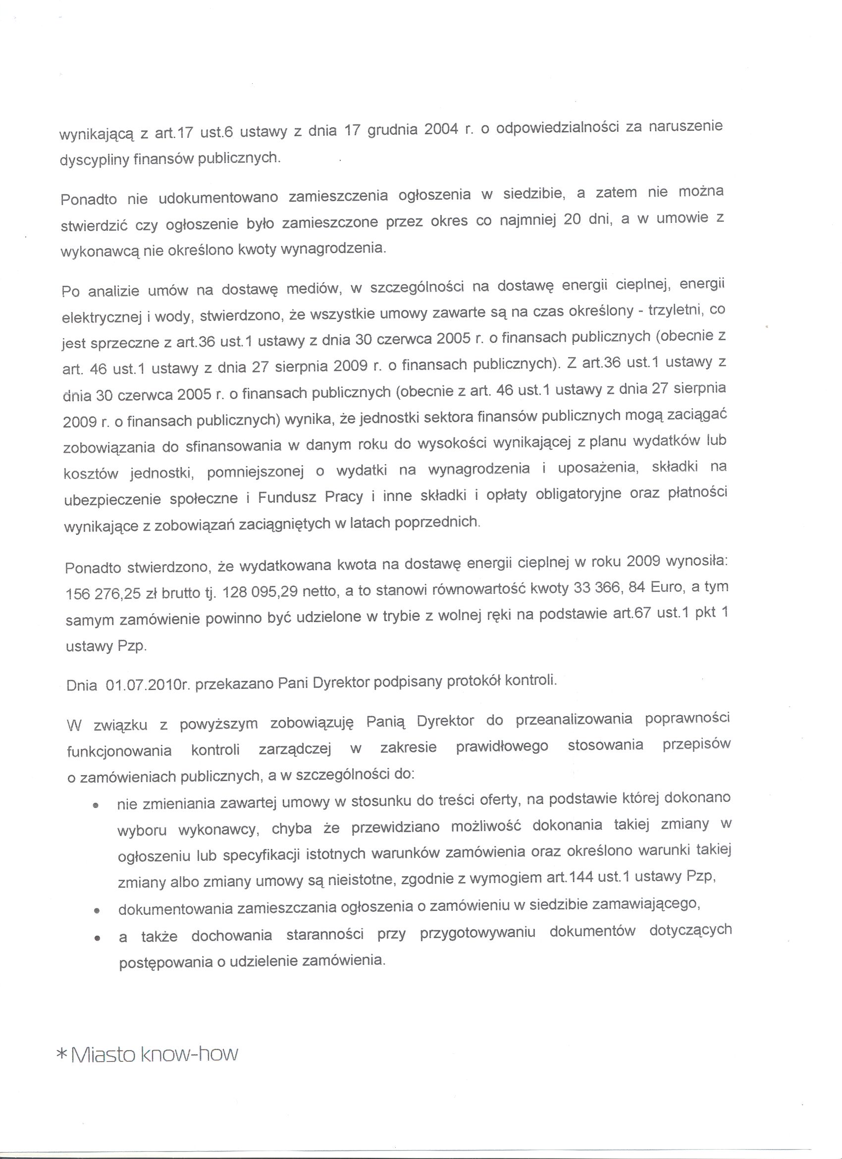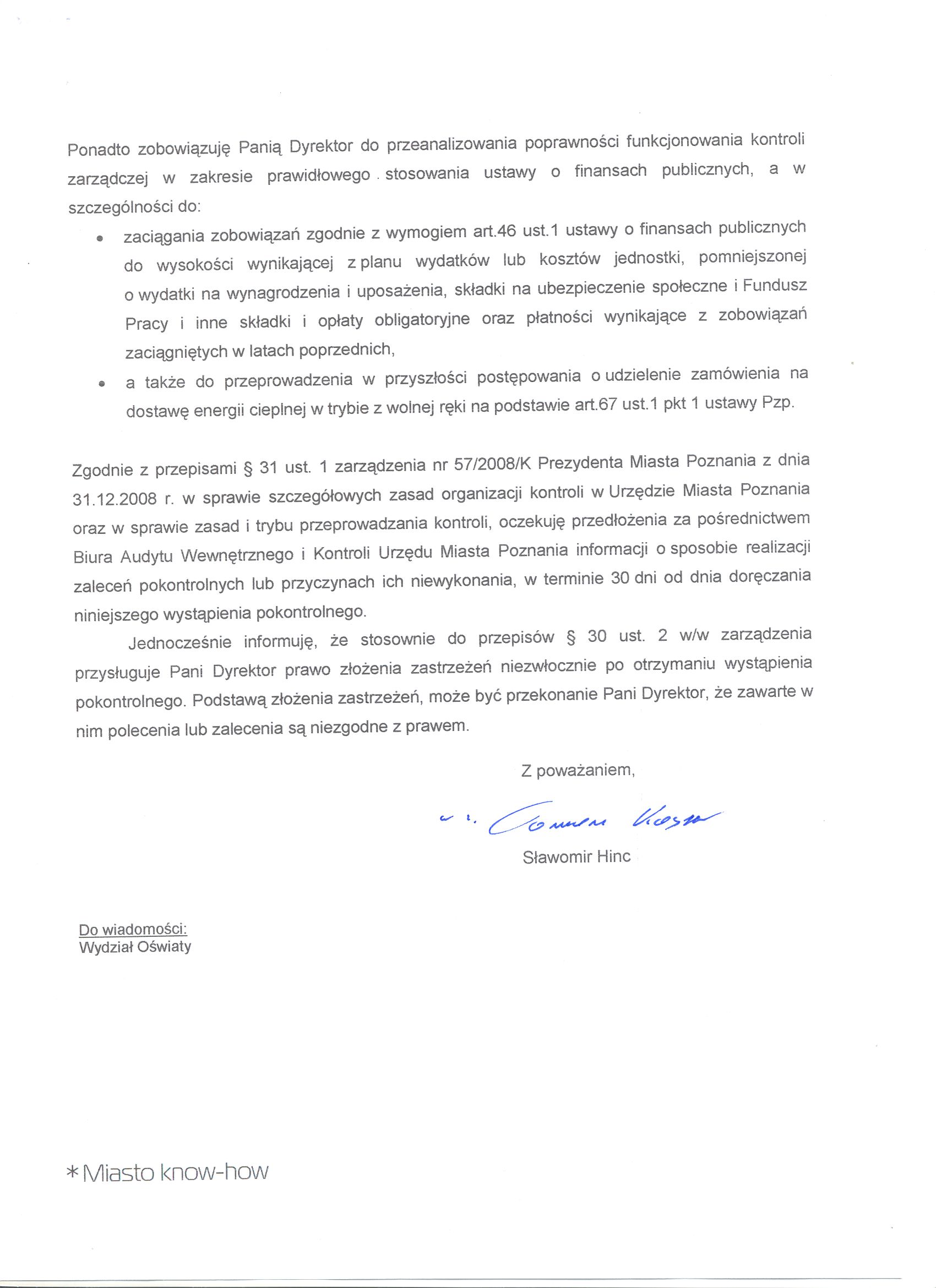 - Ponadto zobowiązuję Panią Dyrektor do przeanalizowania poprawności funkcjonowania kontroli zarządczej w zakresie prawidłowego stosowania ustawy o finansach publicznych, a w szczególności do: