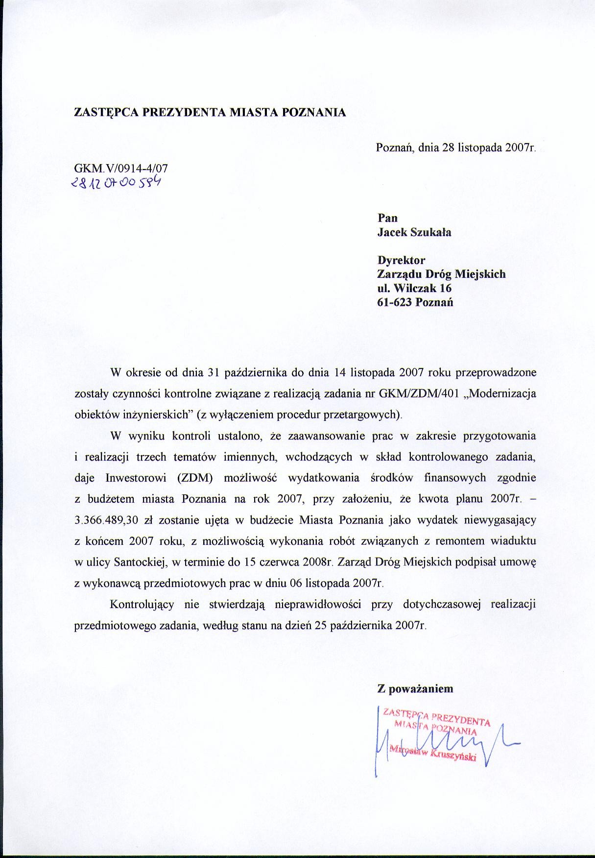 - Jest możliwość wydatkowania środków finansowych zgodnie z budżetem Miasta Poznania na rok 2007, przy założeniu, że kwota planu 2007r. - 3.366.489,30 zł zostanie ujęta w budżecie Miasta Poznania jako wydatek niewygasający z końcem 2007 roku, z możliwością wykonania robót związanych z remontem wiaduktu w ulicy Santockiej, w terminie do 15 czerwca 2008 roku.