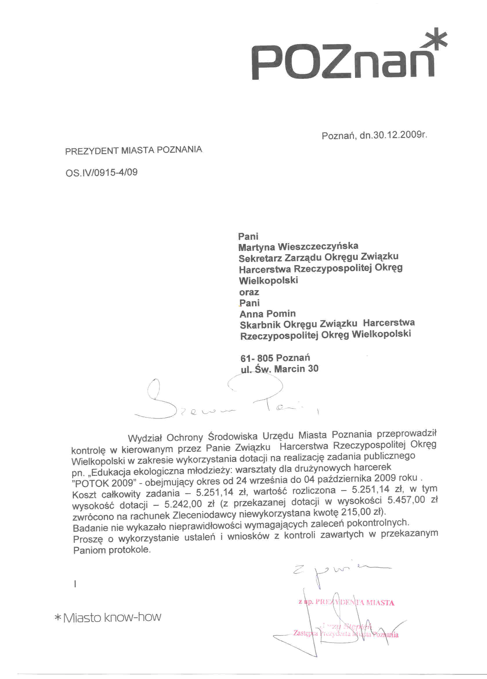 Zadanie publiczne pn. "Edukacja ekologiczna młodzieży: warsztaty dla drużynowych harcerek "POTOK 2009"